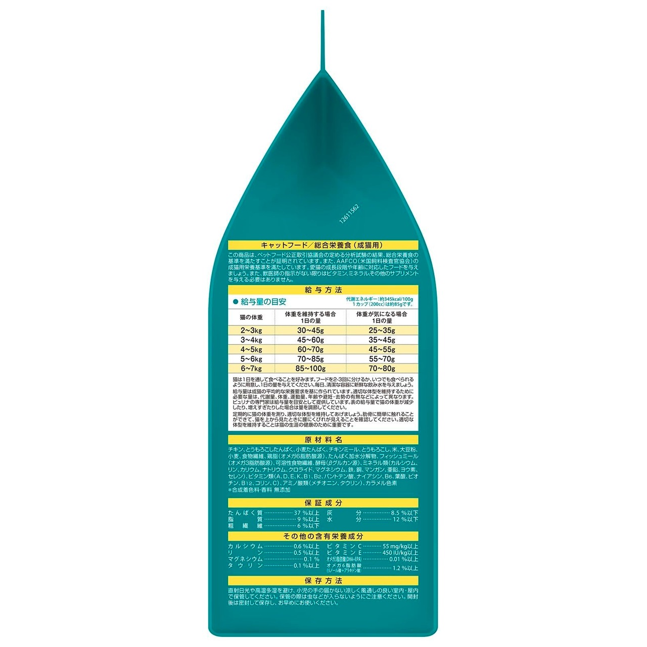原材料:チキン、とうもろこしたんぱく、小麦たんぱく、チキンミール、とうもろこし、米、大豆粉、小麦、食物繊維、鶏脂(オメガ6脂肪酸源)、たんぱく加水分解物、フィッシュミール(オメガ3脂肪酸源)、可溶性食物繊維、酵母(βグルカン源)、ミネラル類(カルシウム、リン、カリウム、ナトリウム、クロライド、マグネシウム、鉄、銅、マンガン、亜鉛、ヨウ素、セレン)、ビタミン類(A、D、E、K、B1、B2、パントテン酸、ナイアシン、B6、葉酸、ビオチン、B12、コリン、C)、アミノ酸類(メチオニン、タウリン)、カラメル色素