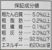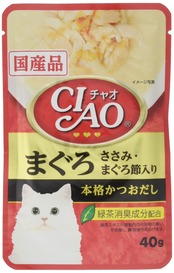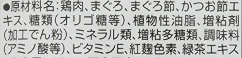 鶏肉、まぐろ、まぐろ節、かつお節エキス、糖類(オリゴ糖等)、植物性油脂、増粘剤(加工でん粉)、ミネラル類、増粘多糖類、調味料(アミノ酸等)、ビタミンE、紅麹色素、緑茶エキス