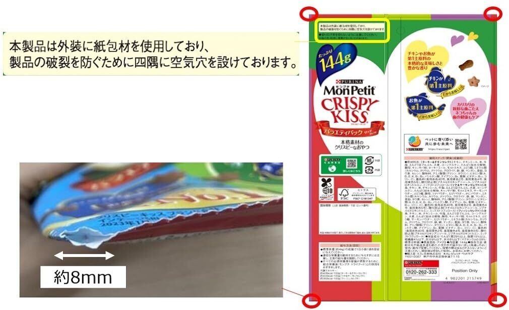 ●おやつとして与える場合:標準体重(約4㎏)の成猫で1日小袋1袋を目安に与えてください。適切な栄養量を維持するために与えすぎには注意し、主食の給与量を調節してください。●主食として与える場合:成猫体重1kgあたり1日小袋2.5袋を目安に、数回に分けて与えてください。