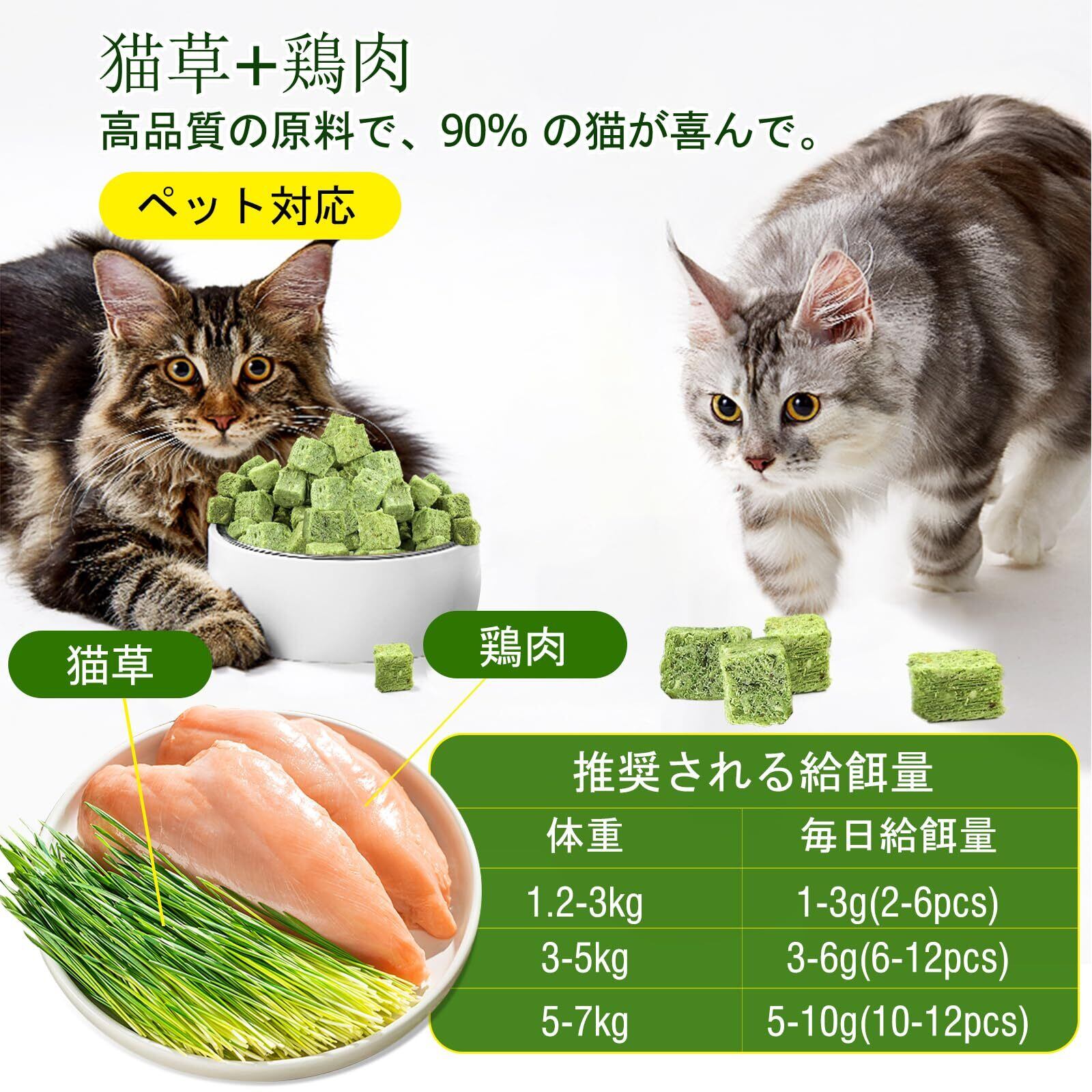 【食べさせ方】。猫が食べすぎないように給与量の目安を確認して下さい。そのまま給食して、或は飼料に混ぜてもいい。猫ちゃんにの猫草スティックを手が持って給食して、猫と飼い主が、お互いにとって親睦を深めます