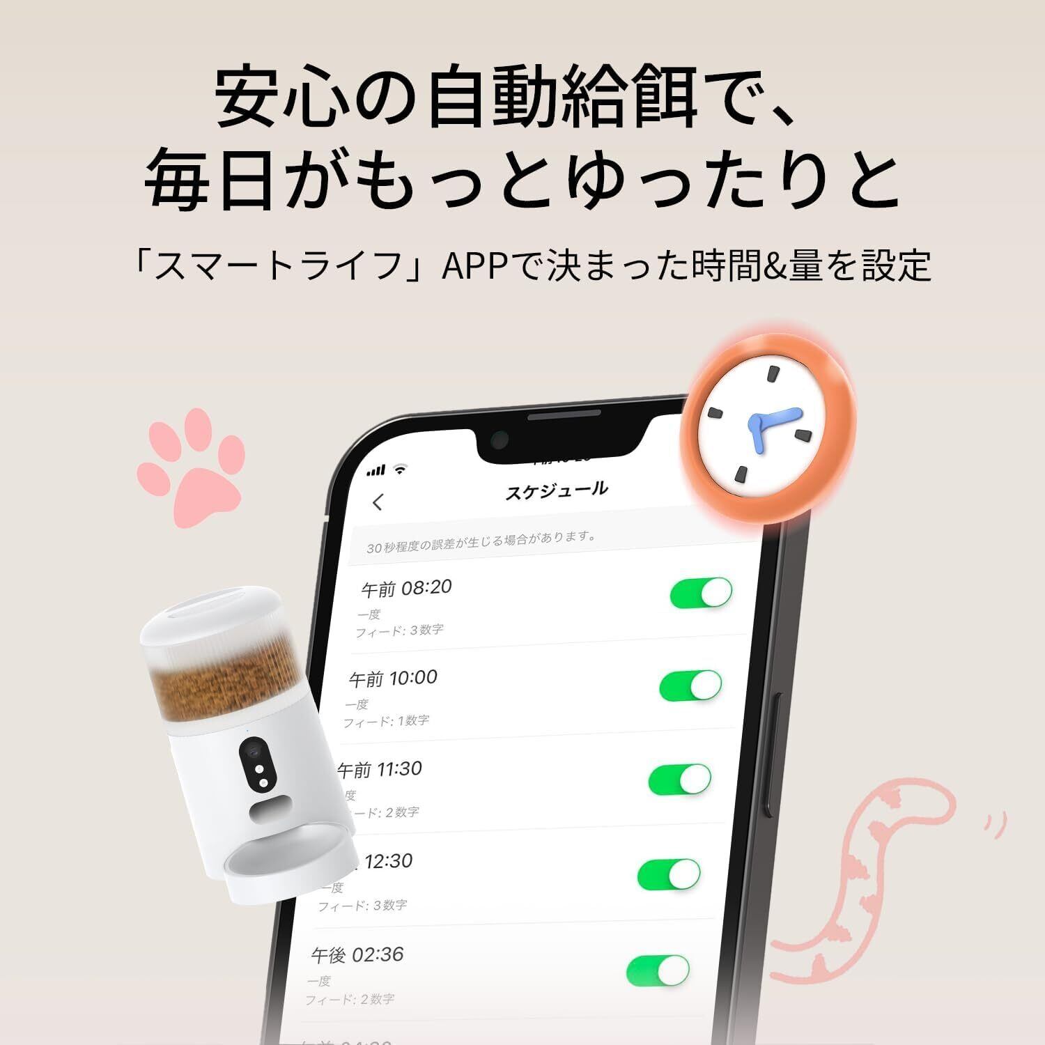 特徴 カメラ, 双方向オーディオ, 取り外し可能, 給餌スケジュール