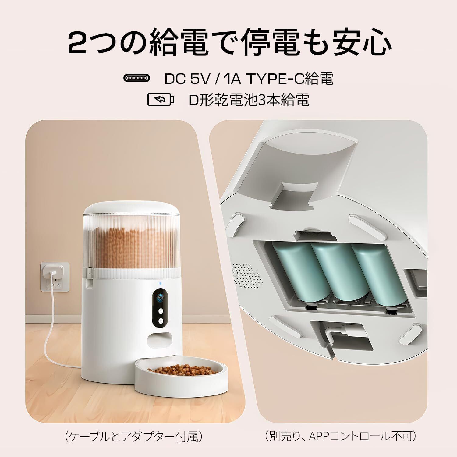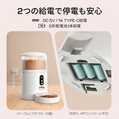 [大容量4Lとデュアル電源システム] 最大4L(約16.9カップ)のドライフードを収納でき、冷凍乾燥フードやエアドライフードにも対応しています。内蔵の乾燥剤バッグでフードの鮮度も保たれています。耐噛み性のUSBケーブルに加え、停電時にはD形乾電池給電3本(別途購入)がバックアップとして利用可能。この製品はネット接続が切断されても、停電でも自動給餌が継続します。