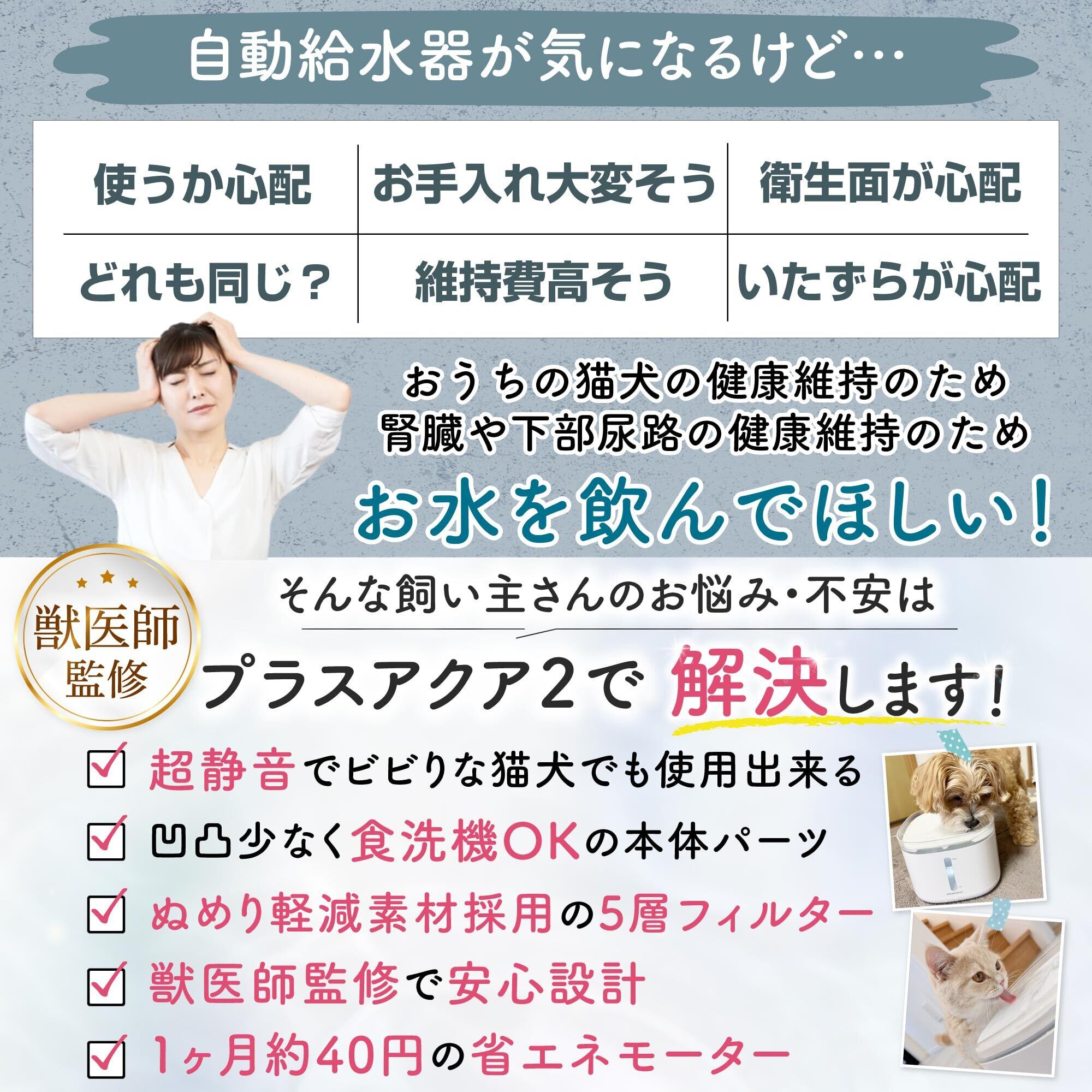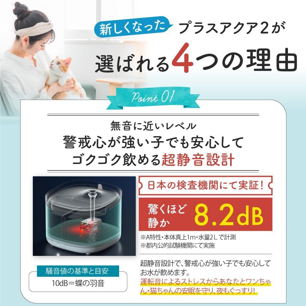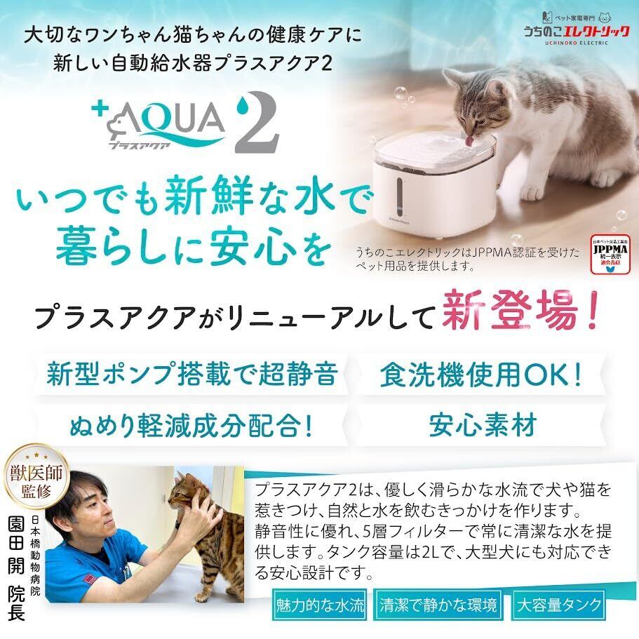 【獣医師監修】 うちのこエレクトリック プラスアクア2 猫 犬 自動給水器 8.2dB 食洗機対応 フィルター5層構造 KDFぬめり軽減素材配合 安心の日本メーカー 活性炭フィルター ヤシ殻活性炭 イオン交換樹脂