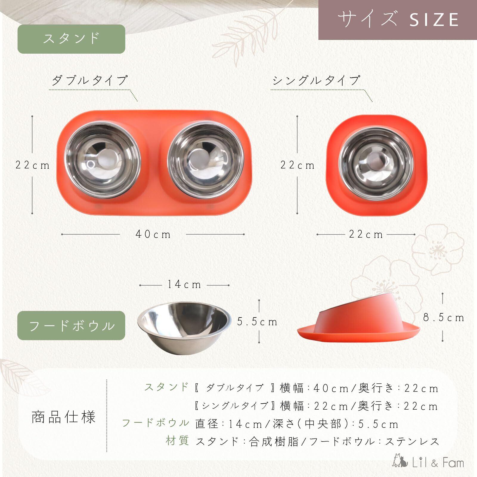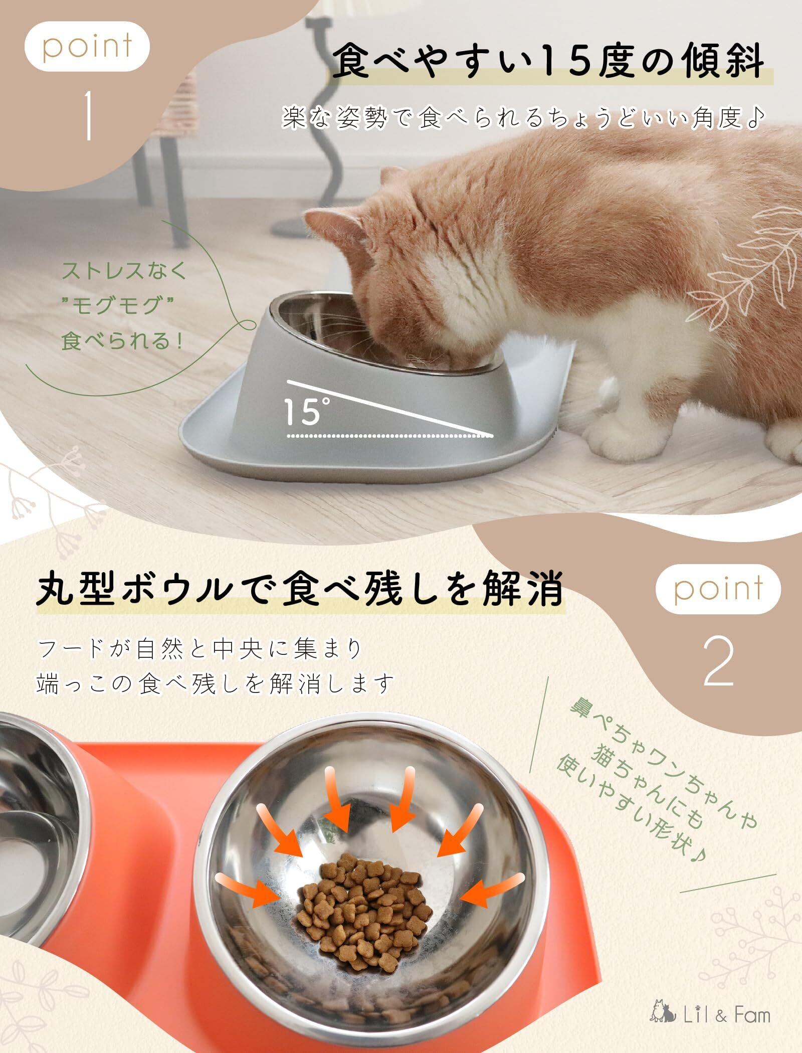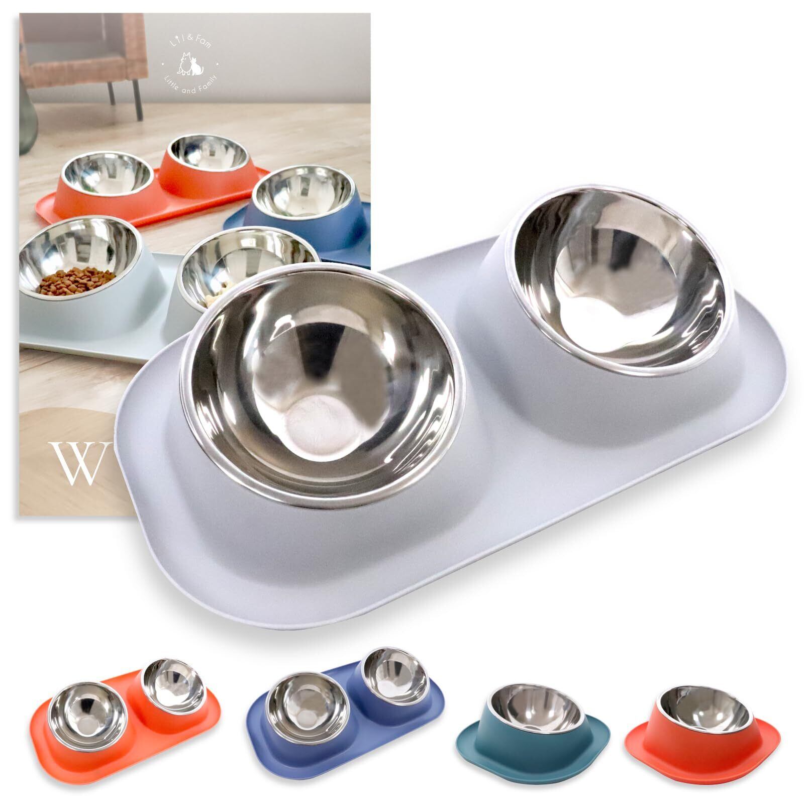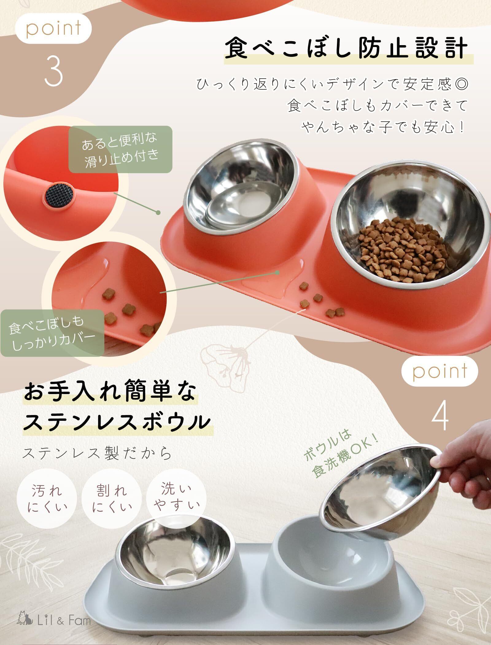 Lil&Fam 犬 猫 フードボウル 【15度の傾斜&食べこぼし防止スタンド付き】ステンレスボウル 犬 猫 ペット 餌入れ 皿 食器 餌台 ご飯台 (グレー, 大(ダブルボウル))