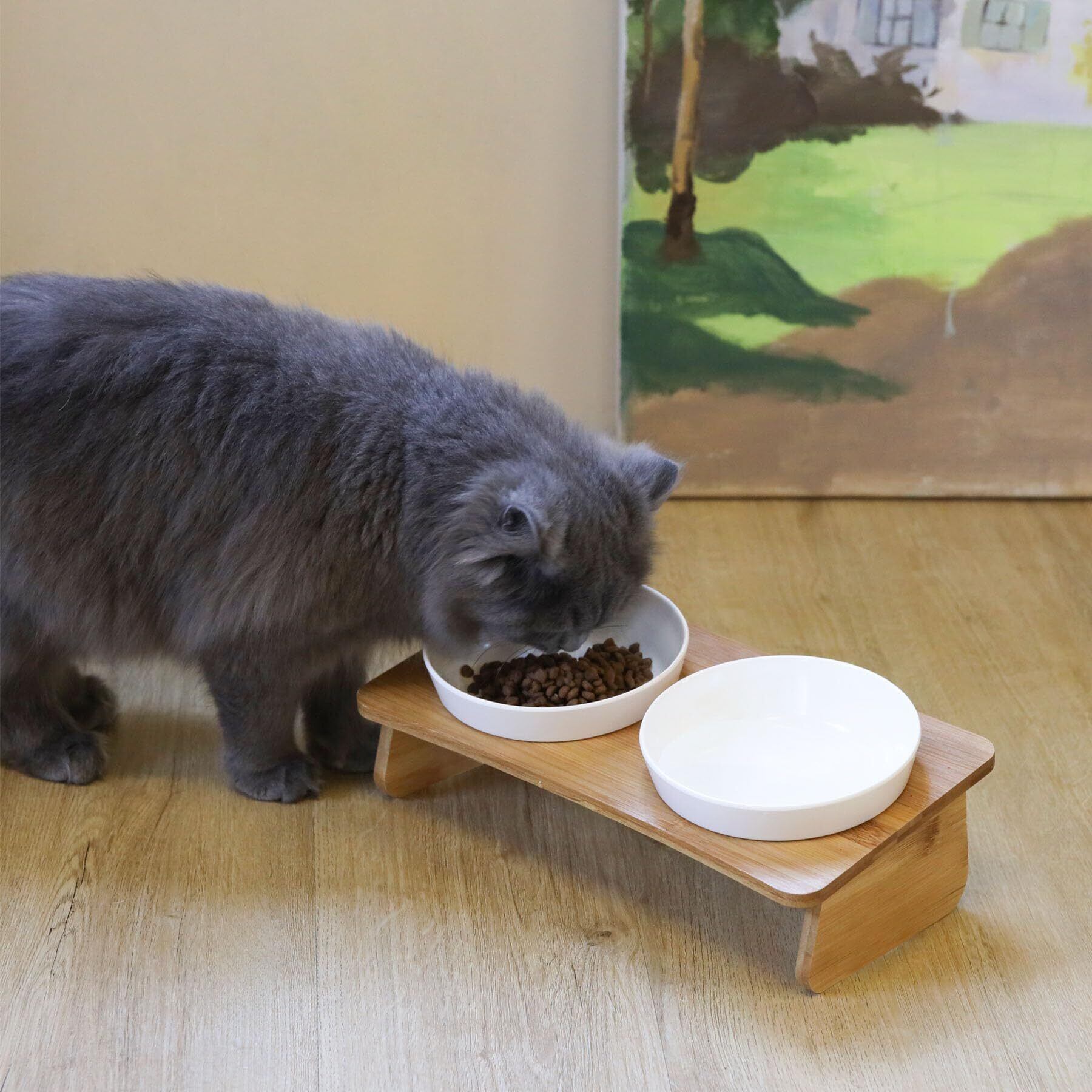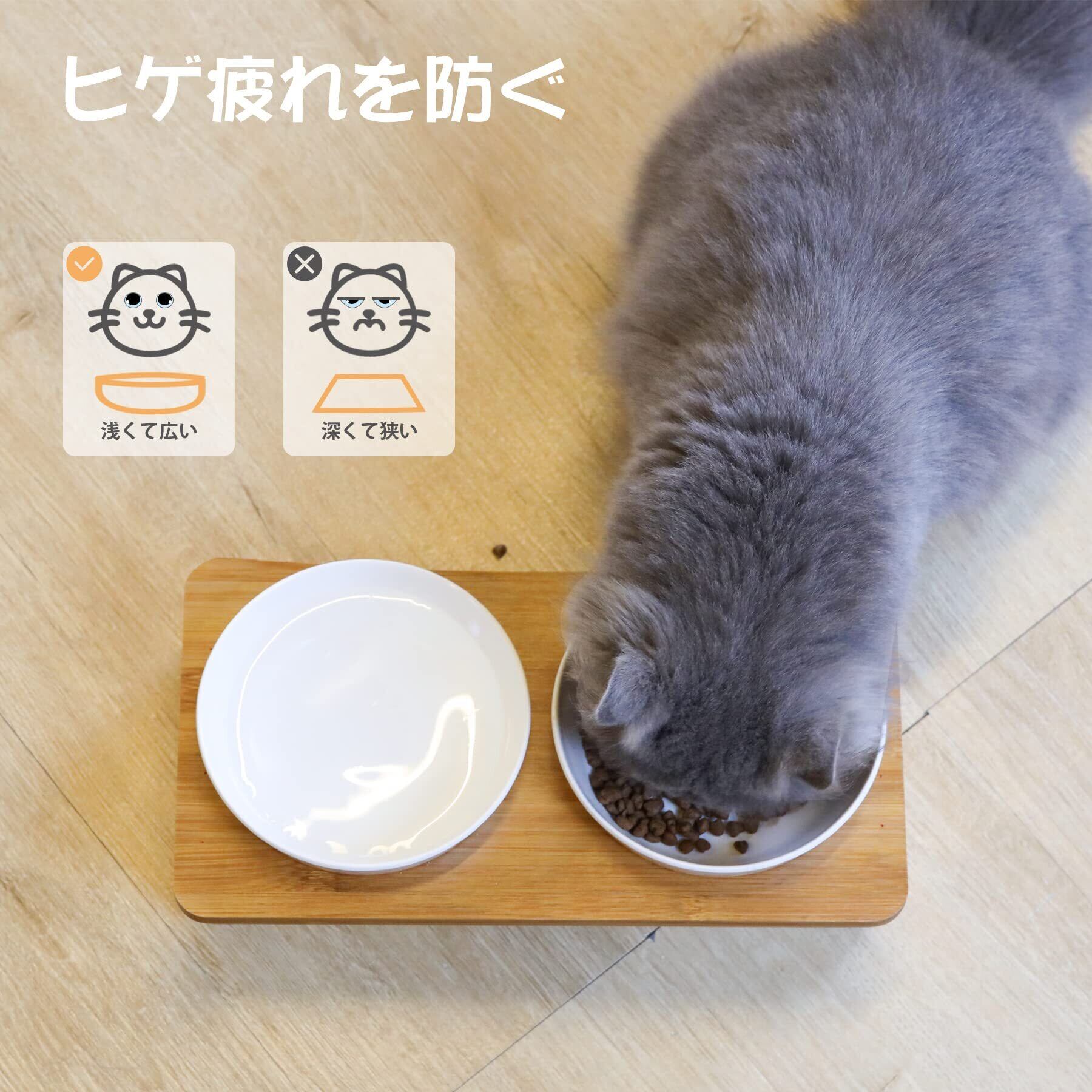「浅広口タイプ」幅が広い浅皿で、ヒゲに食器が当たりにくく、ヒゲへの倦怠感を軽減できます。容量:ドライフード入れの場合:約140g/個、水入れの場合:約125ml/個。竹製スタンドサイズ: 29x15.5x8.5cm(幅x奥行x高さ)、フードボウル内径:13.5cm。 パッケージ内容:猫フードボウルx2個、竹製スタンドx1個、滑り止めシールX4個、重量:1kg