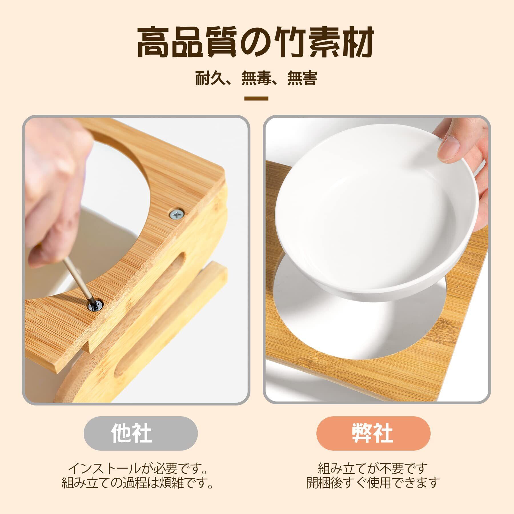 「安全の材質」食品衛生法の基準に適合する上質なメラシン樹脂で作製される猫食器で、猫の健康を確保できます。台座 はナチュラルな竹で仕上げられ、表面には塗装を施され、カビが生えなくて耐久性も高いです。