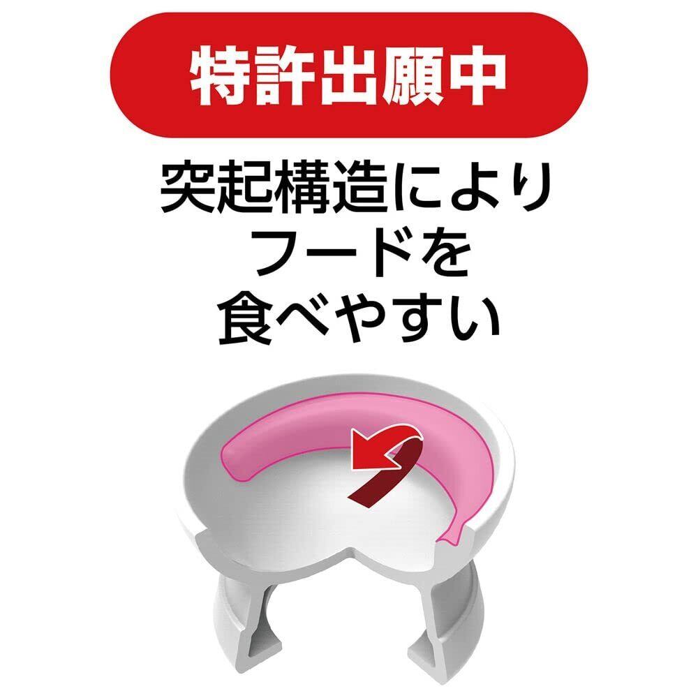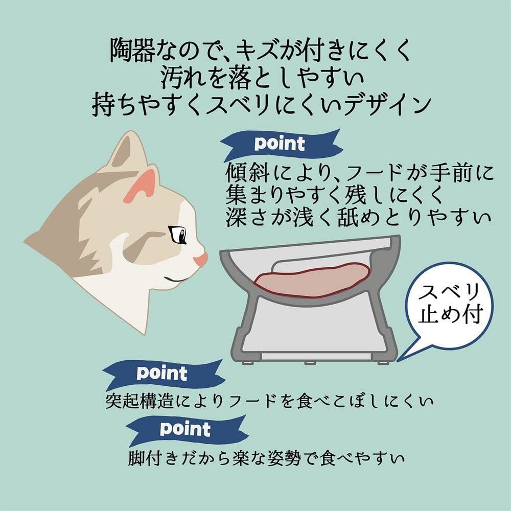 陶器なので、キズが付きにくく汚れを落としやすい。持ちやすくスベリにくいデザイン。傾斜により、フードが手前に集まりやすく残しにくい形状。深さが浅く舐めとりやすい。突起構造によりフードを食べこぼしにくい(中)。脚付きだから楽な姿勢で食べやすい。