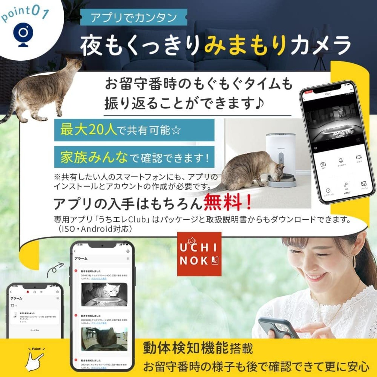 動体検知機能搭載のペットカメラでさらに安心。自動給餌器として、ペットカメラとしてフル活用していただけます。