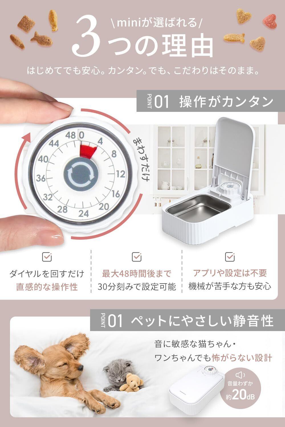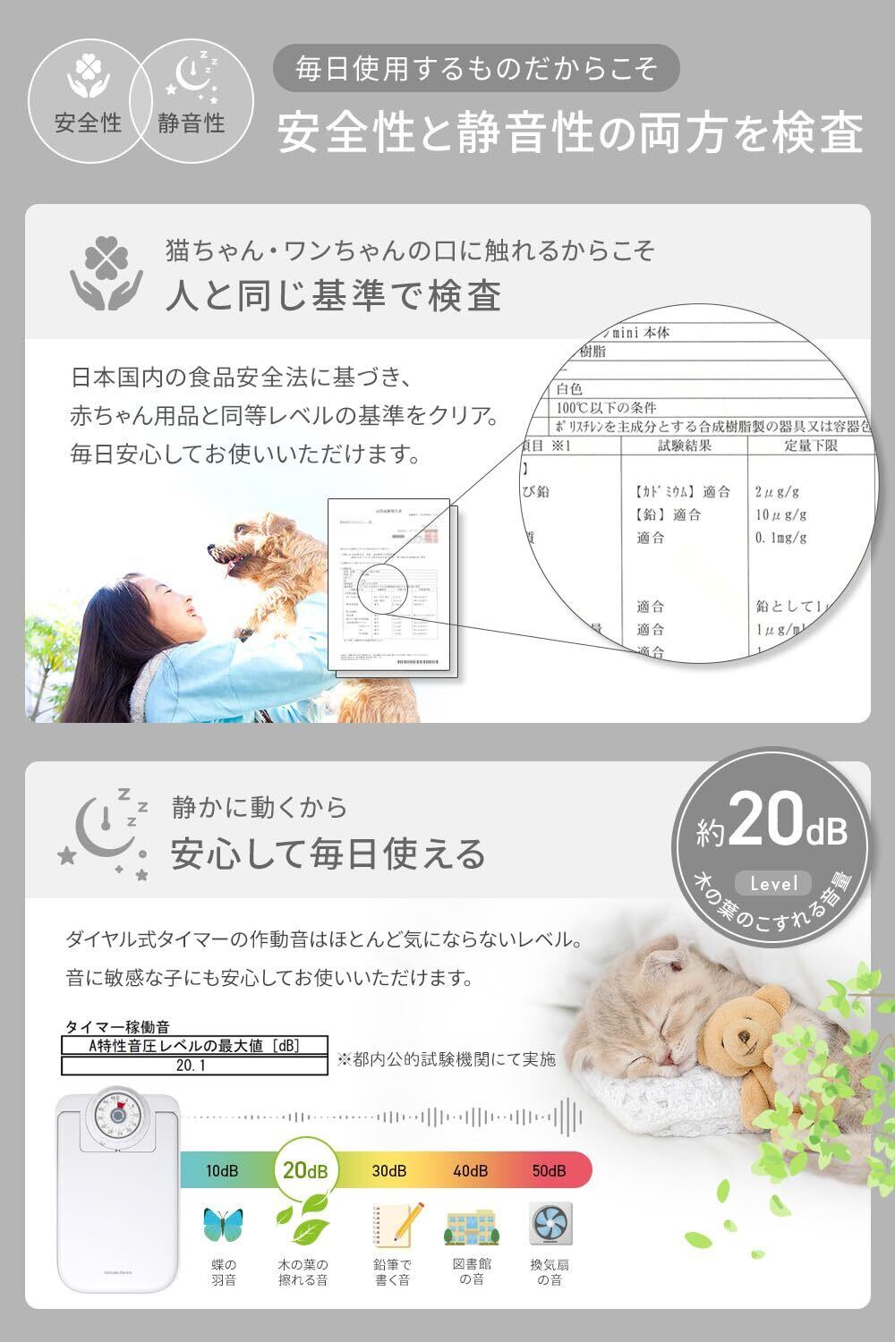 【静音設計 約20dB】 タイマー作動音は木の葉のこすれる音ほどの静かさ。音に敏感な猫ちゃんやワンちゃんも怖がらず、夜間や就寝中でも安心です。