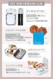 【仕様詳細】 ・サイズ:約W141×H76×D230mm ・重量:約0.65kg(ステンレストレイ・アイスパック含む) ・トレイ容量:約350ml(フード約190g) ・電源:単三アルカリ乾電池1本(※付属しておりません。お客様でご用意をお願いします。) ・電池寿命:約12カ月(1日1回使用の場合) ・タイマー:最大48時間(30分刻み) ・対応フード:ドライ・ウェット・フリーズドライなど