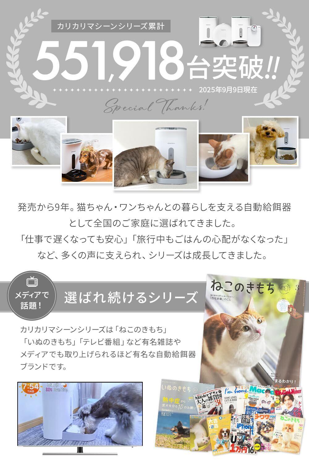 【シリーズ累計55万台突破】 実績と信頼の自動給餌器シリーズ「カリカリマシーン」から新しくエントリーモデルとして誕生しました。猫ちゃん・ワンちゃんの健康を守るため、はじめての飼い主さんにも安心して選ばれています。