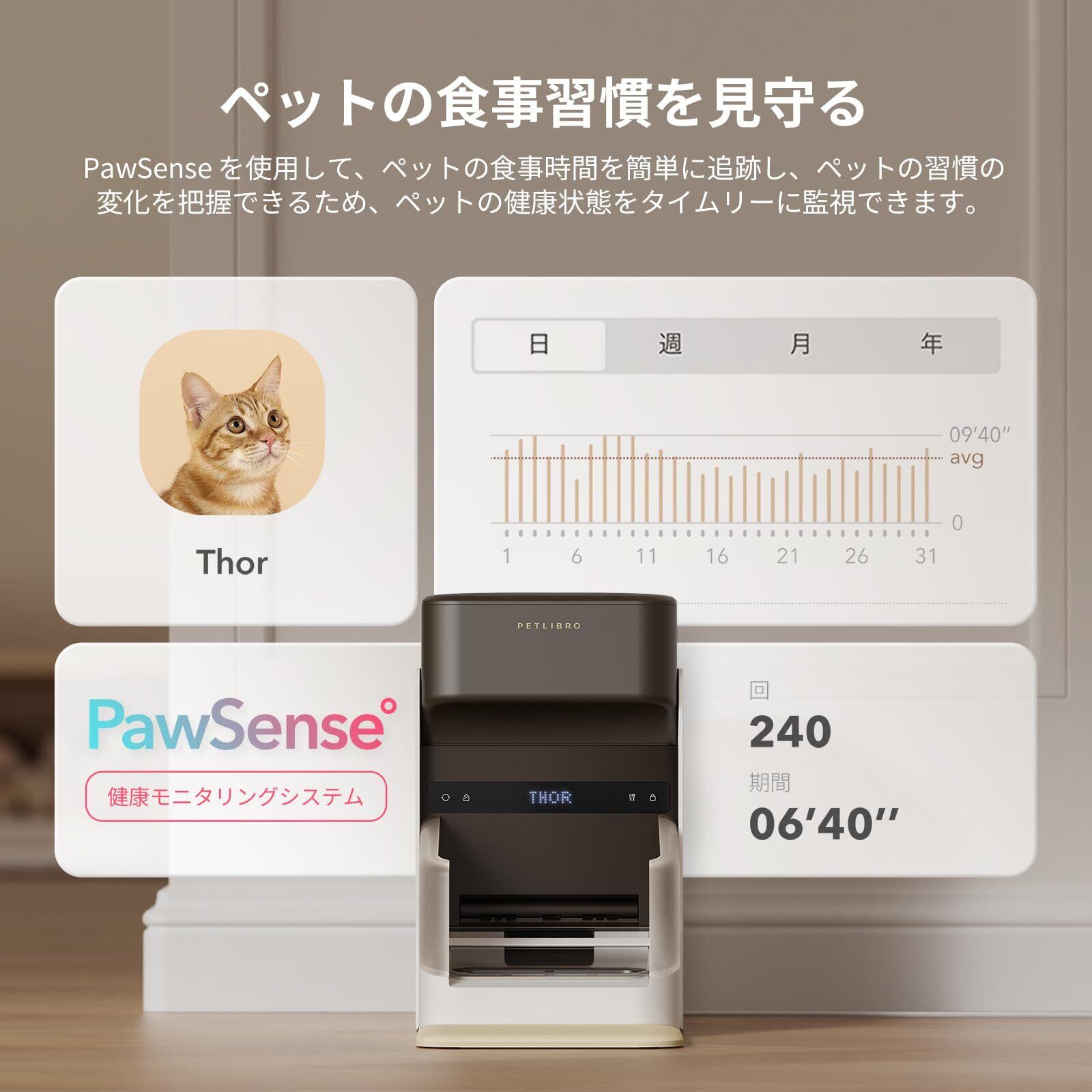 【スマホで遠隔管理可能】専用の感知可能な首輪タグを搭載したPETLIBROスマート給餌器は、アプリのパウセンスによってサポートされ、ペットの食事時間と頻度を監視します。更に、アプリで餌のスケジュール管理ができるので健康管理もできます。洞察に満ちたデータレポートを生成し、食べ過ぎを防止し、ペットの食習慣を包括的に理解することができます。