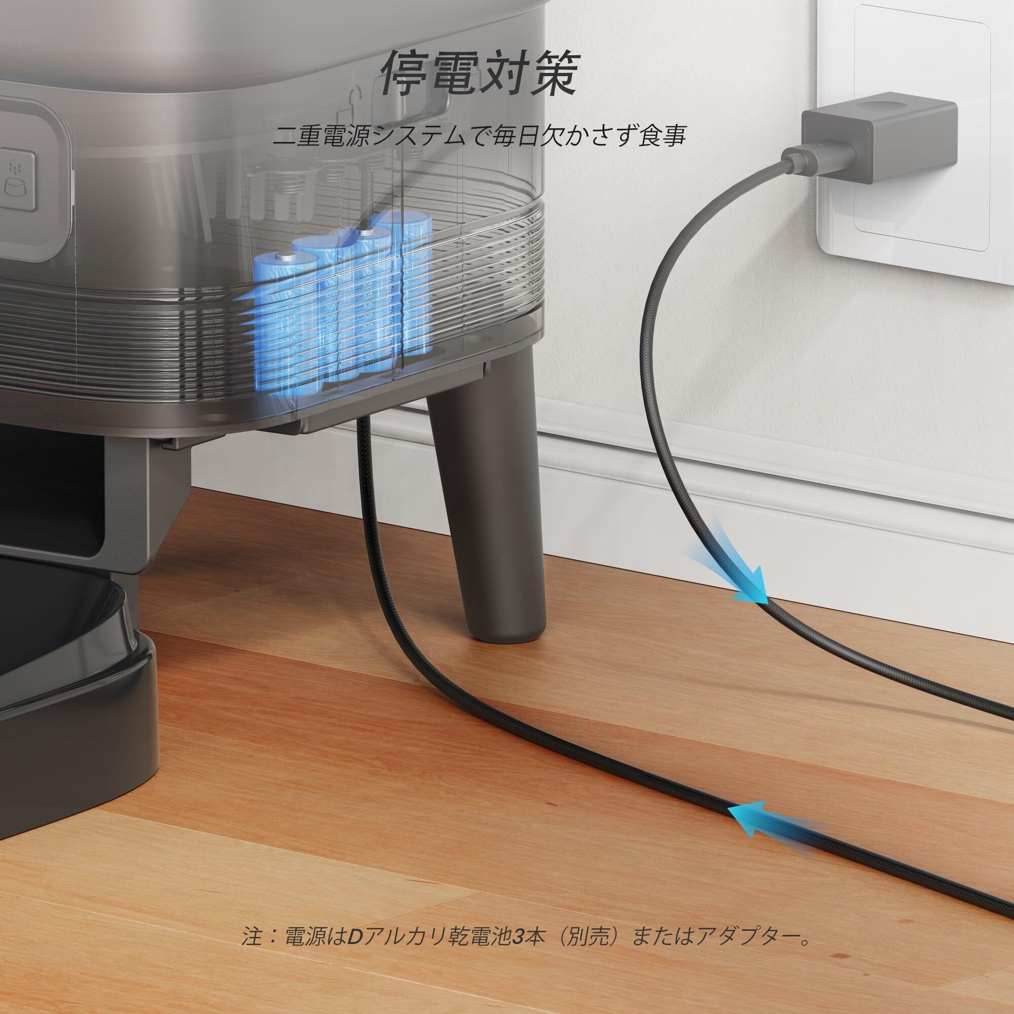 【二重電源 停電対策】えさやり器自動は5V ACアダプターと単三電池4本バックアップシステムで駆動します(電池は付属しません)。停電しても給餌を中断することなく電池で動作し続けるので、万が一の緊急時にも安心してご使用いただけます。メモリー機能があり、突然の停電でもタイマーが無効になることはありません。あらゆる種類のペットための多用途な解決策です。