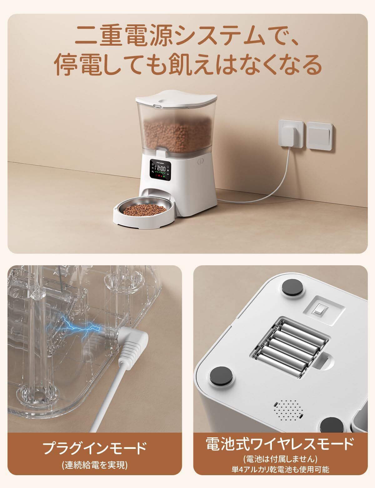 【2WAY給電】USB電源とは別に、単4アルカリ乾電池も使用可能です。停電時や、ペットのいたずらでコードが抜けてしまった時なども自動的に電池給電の方法に変更し、確実に給餌が行なえます