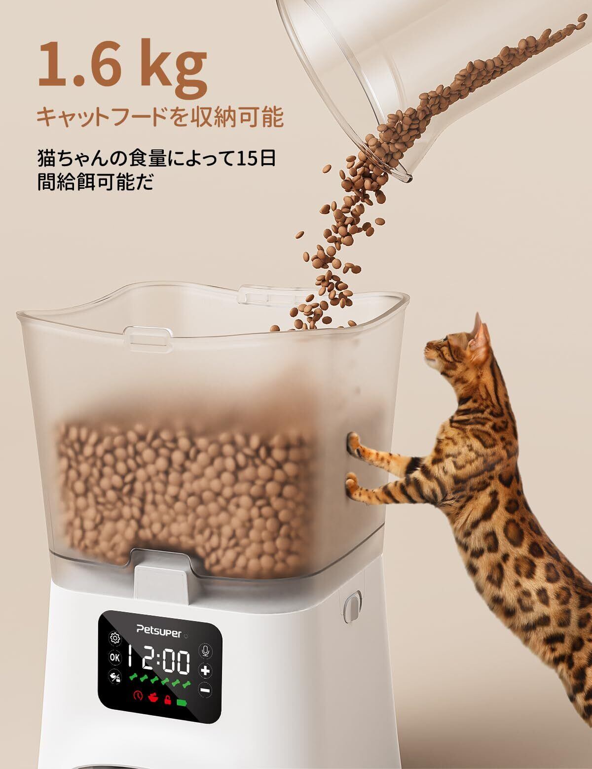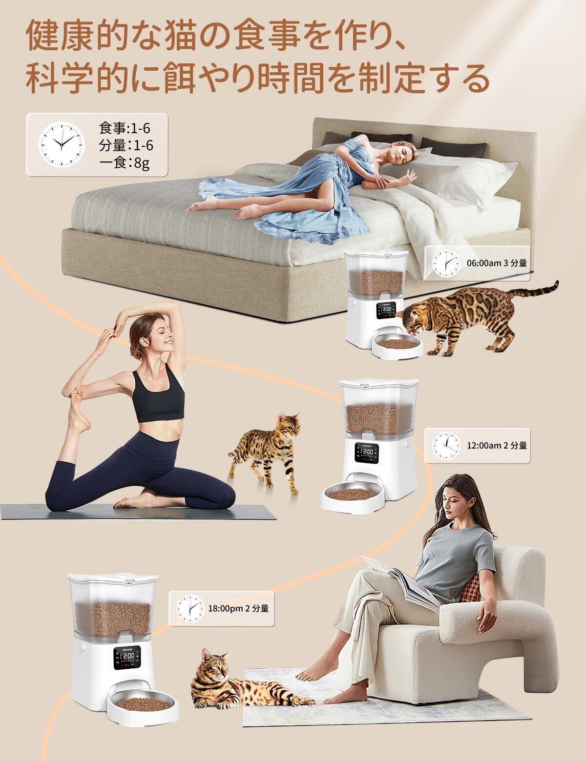 【定時定量】自動餌やり器は1日6回まで給餌可能、ペットの肥満対策、改善。每回フードを計測する手間が省けて、大切なペットの健康管理もよりしやすくなります。1回は最大6食設定でき、1食が約8G±2Gとなります。