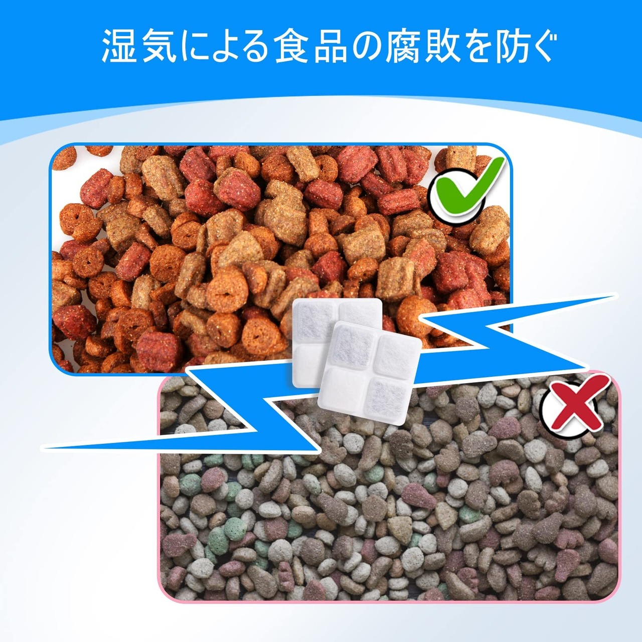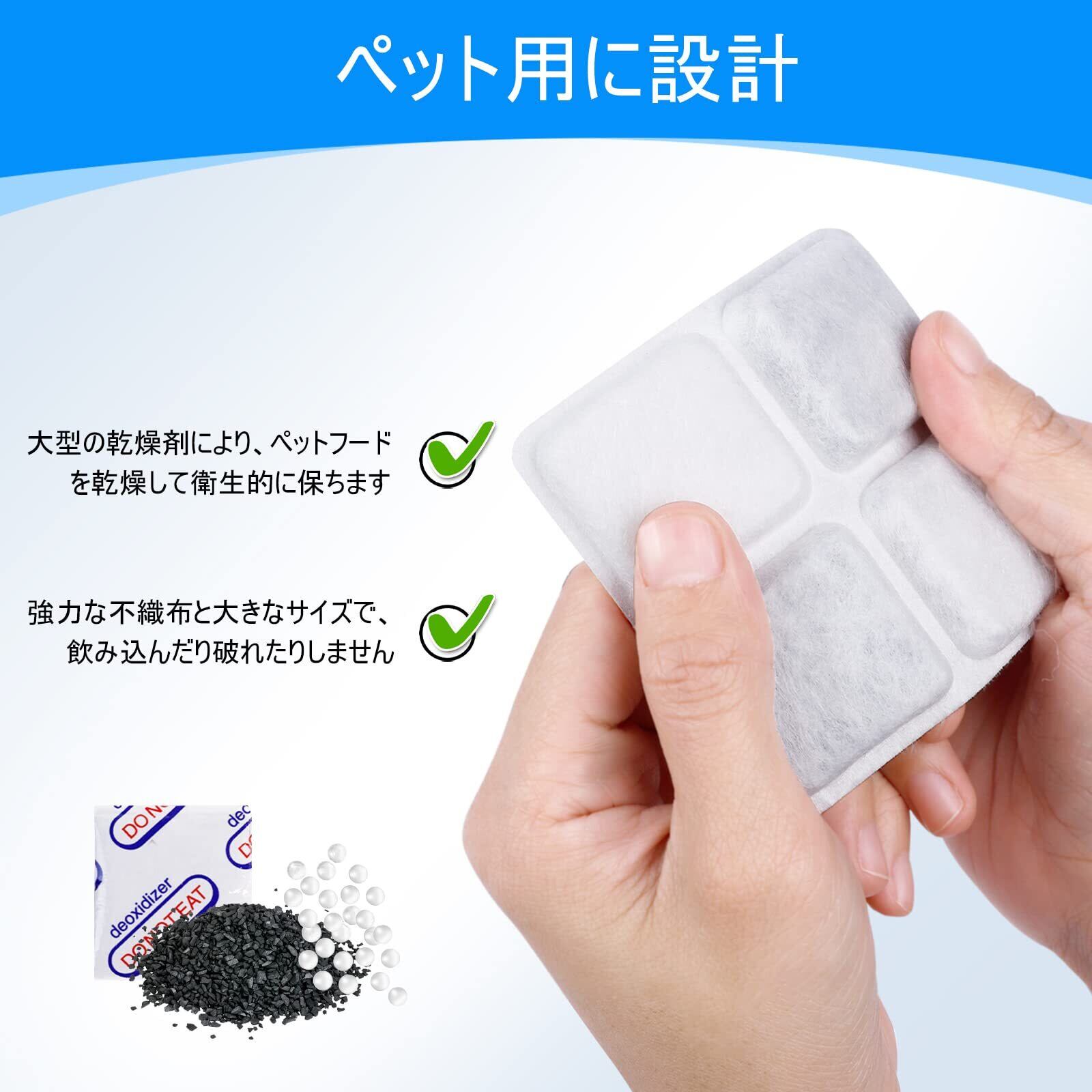 長期保存のための個包装: ペットの食事を常に新鮮に!個包装で長寿命のペットフード用乾燥剤は、ペットフードの美味しさを維持し、いつでも新鮮な状態を保ちます。1~2週間の目安で交換し、季節や給餌器の場所により柔軟に使用調整が可能。開梱まで待つことで、いつでも即席で新鮮なペットフードを提供できます。