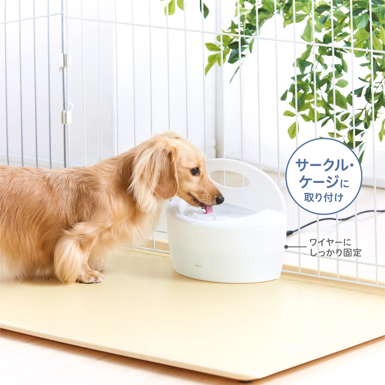 薄型でどこでもフィット!サークル・ケージに取り付け、または付属の専用ベースで壁沿いに置ける2WAY仕様。固定パーツでサークル・ケージにしっかり固定。差し込み式なので取り外しがカンタンでお手入れもラクラク。ファンネルはワンちゃんの飲みやすい深めの仕様。ネコちゃんには付属の専用アタッチメントでこぼれ落ちるお水を。
