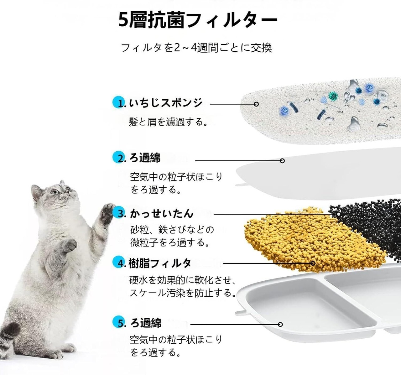 【六重ろ過設計】APD APETDOLA 猫水飲み器フィルターは革新的な六層濾過設計を採用され、浄化された水を大切なペットにご提供いただけます。三層濾過設計に比べて、埃、髪の毛、嫌な臭い及びカルシウムなどの濾過効果がより良いです。