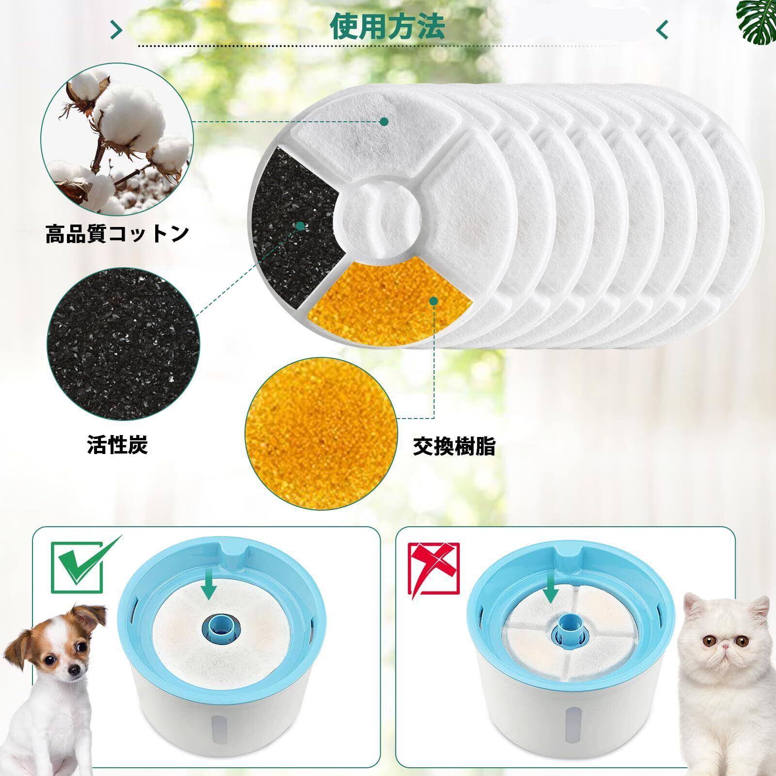 【使用方法】使用前にフィルターを水で3~5分間よくすすぎ、炭の粉やほこりを取り除いてください。フィルターを不織布の面を上に向け、フィルターの凸面を対応する溝に合わせてみずのみ器にセットすれば完了です。 水の鮮度を保つため、フィルターは1~2週間ごとに交換することをおすすめします。(交換サイクルは使用状況や環境により異なります。)