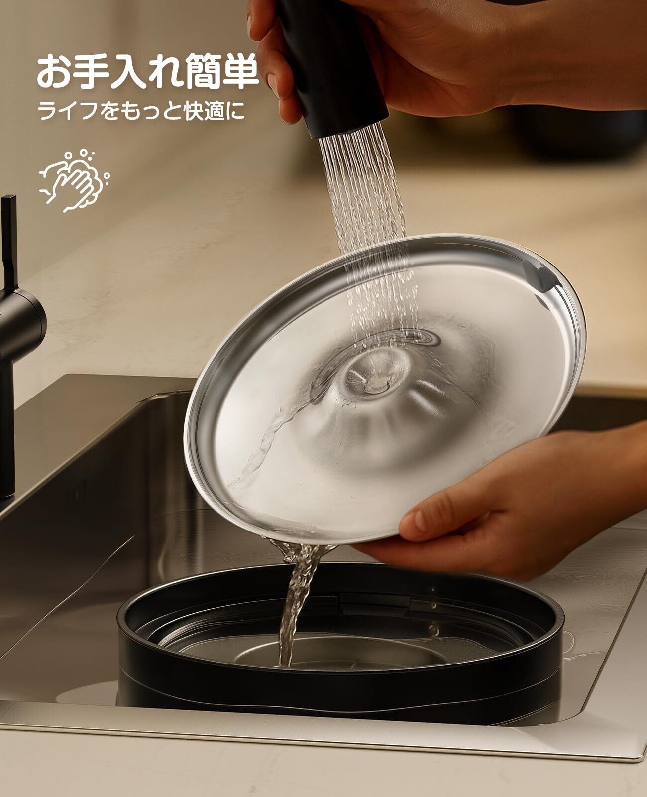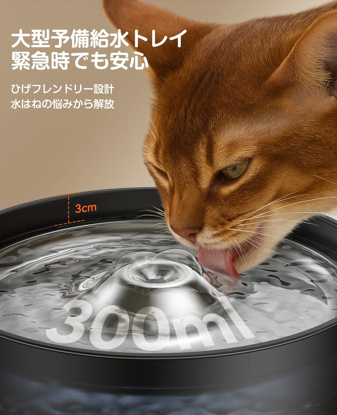 ステンレス緊急用水盤:この猫給水器は大容量の緊急用水盤を装備。排水口が高い設計のため上部に水が残留し、停電やポンプ故障時にも一時的な飲用水を確保できます。