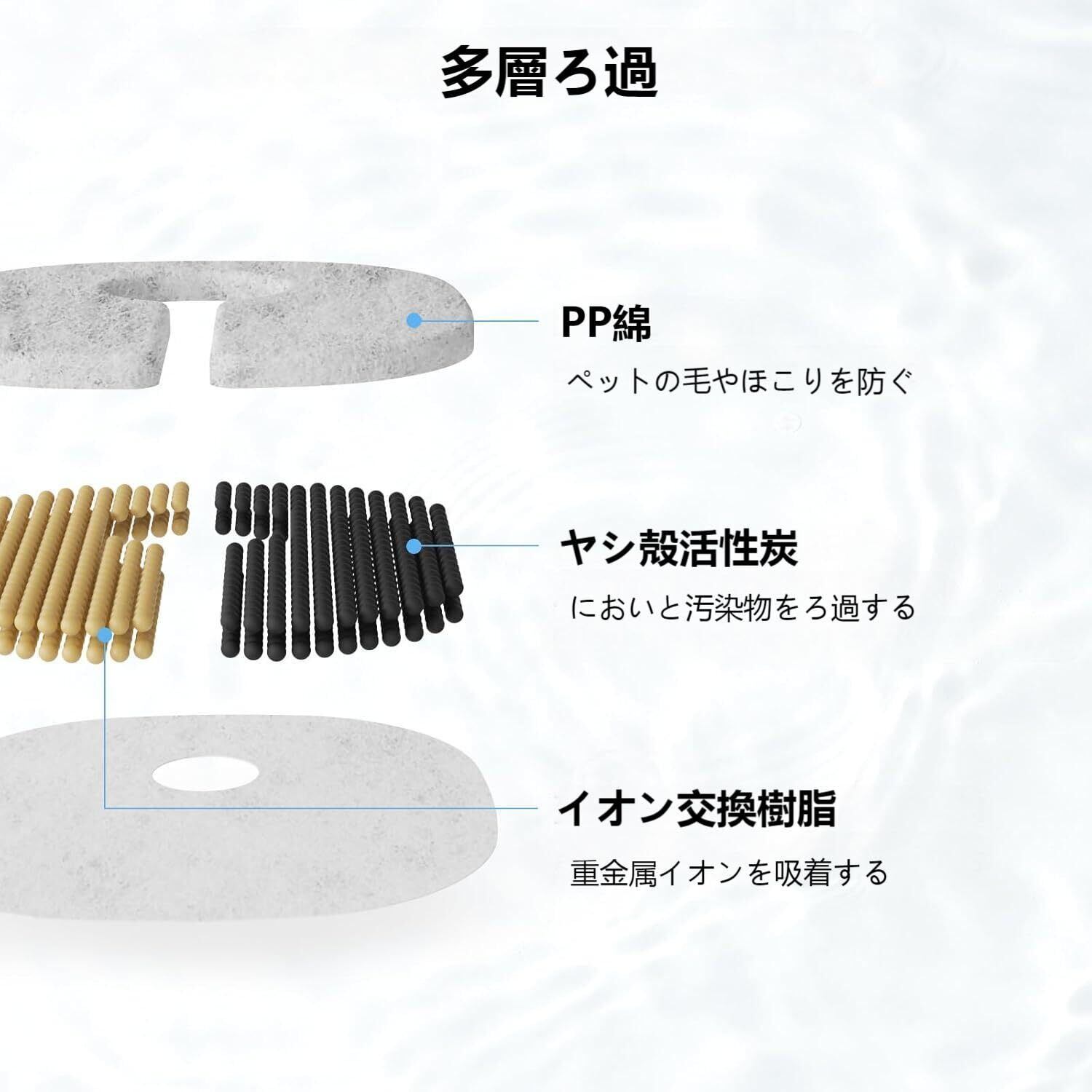 【4層浄水ろ過で新鮮な水提供】ペット給水器用フィルターは活性炭、イオン交換樹脂、コットンを使って、四層構造を設計されて、多重ろ過を実現し、髪の毛、重金属、残留塩素などの水中に見えない粒子を除去することができる。それは浄化と清新な水を助け、尿路感染のリスクを下げることができる。