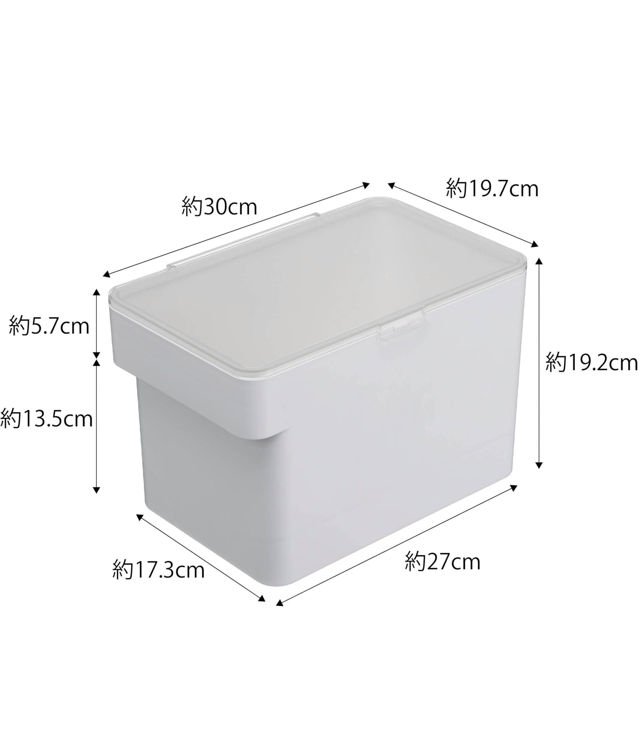 商品サイズ:本体:約W30×D19.7×H19.2㎝(蓋開口時:約H37.5㎝) ▪内寸:開口時:約W27×D17.5㎝ ▪容量:本体:6L(ドライペットフード:約3.5㎏) 計量カップ:180ml