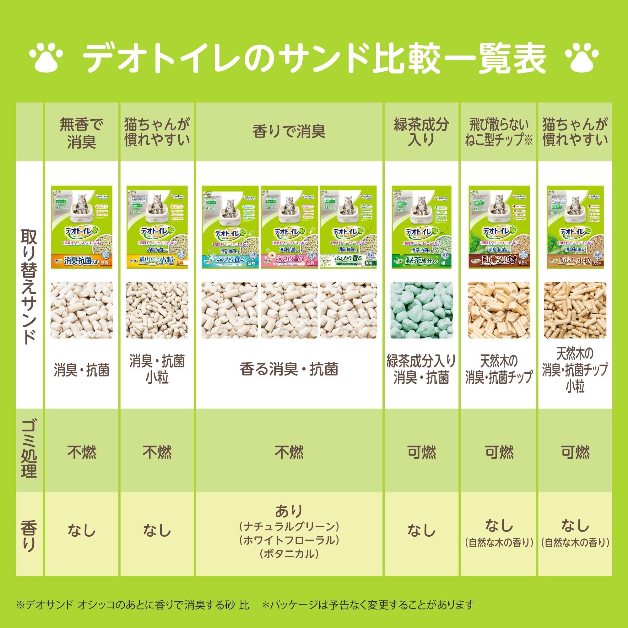 ・サンド表面にオシッコ汚れを残さず通過し、ニオわない*1・紙タイプだから、可燃ゴミで処理OK・1ヶ月交換不要*2・飛び散りにくく、転がりにくい形状*3*1オシッコ汚れとはサンド表面に残ったオシッコ液のこと*2愛猫1頭(体重8kgまで)のデオトイレ使用時。ウンチをした場合は早く取り除いてください*3デオサンドオシッコのあとに香りで消臭する砂比