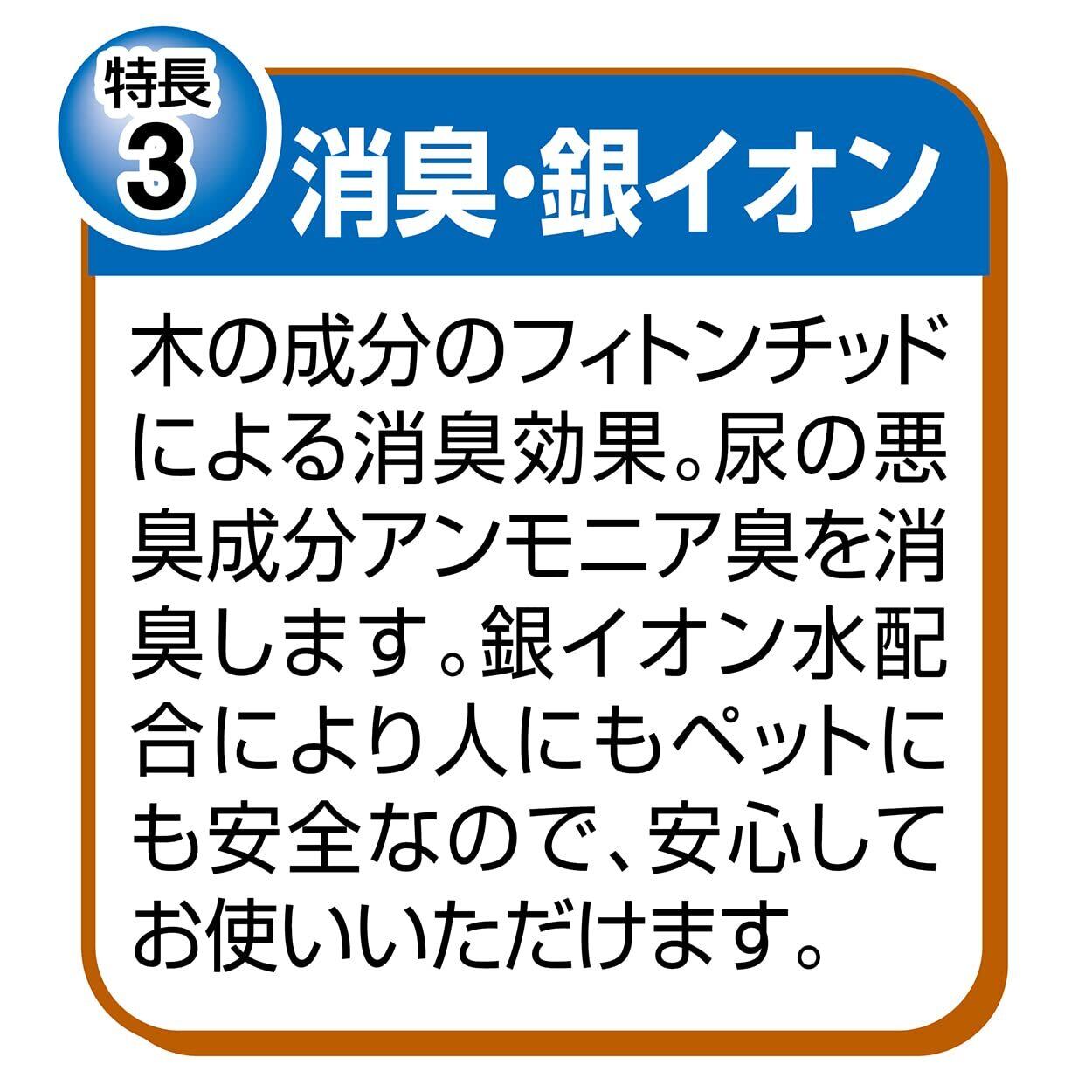 ●環境に優しい:主原料にリサイクル材の木粉を使用しています。リサイクル材を使用することで、循環型社会に貢献します。●小さく固まる:すばやく小さく固まるのでお掃除も簡単です。少ない量で固まるので経済的にお使いいただけます。※固まり具合は、愛猫の個体差によって異なります。●消臭・銀イオン:木の成分のフィトンチッドによる消臭効果。尿の悪臭成分アンモニア臭を消臭します。銀イオン水配合により人にもペットにも安全なので、安心してお使いいただけます。●流せる・燃やせる:尿を吸収した部分だけを水洗トイレに流せるので処理も簡単です。木粉が主原料なので可燃ゴミとしても処理できます。●ベントナイトフリー:ベントナイト(粘土鉱物)は一切使用していないので、軽くて持ち運びにも便利です。