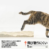 【飛び散り-0.6】飛び散りにくい:猫の爪に挟まりにくいおから猫砂が、小粒のベントナイト猫砂とでんぷん猫砂の隙間を補い、さらに適度な重みがあるため、飛び散りを抑える。