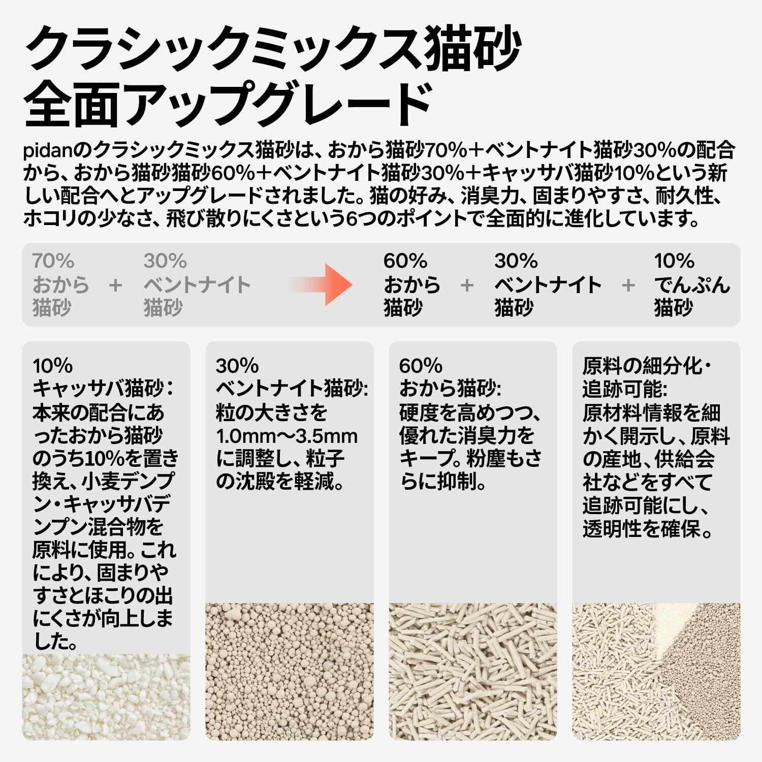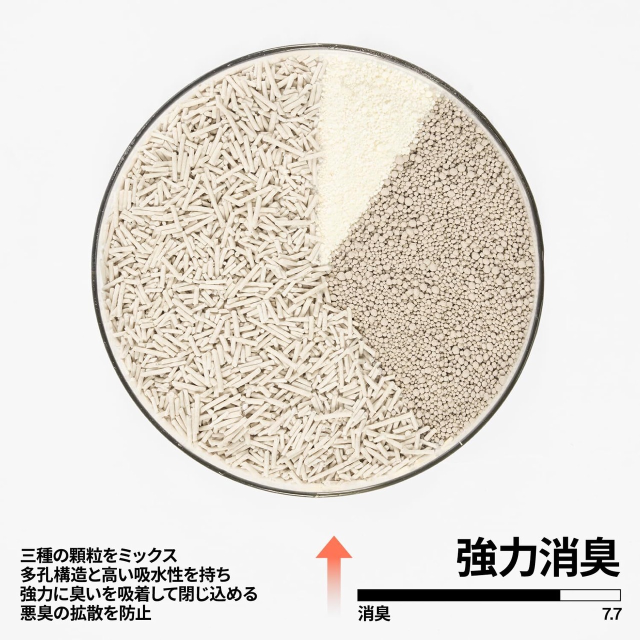 【複数の猫砂をMIX】 消臭力の高いおからに加えて、ベントナイトも加わることでさらにパワーアップ大きさの異なる猫砂を配合することで隙間がなくなり、水分の吸収率が向上します