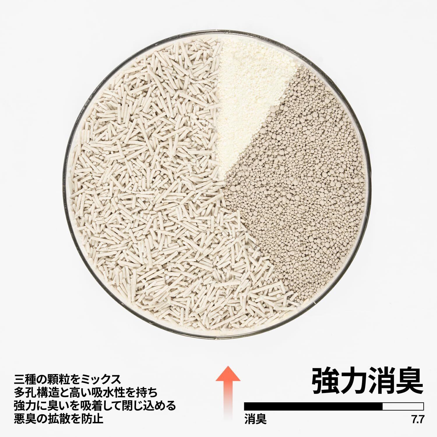 【ホコリ-1】粉末になりにくい:小さな顆粒で密度の高いでんぷん猫砂と硬度の高いおから猫砂、粒径のそろったベントナイト猫砂を組み合わせることで、しっかりと固まり、崩れにくく、粉塵の発生も抑えます。