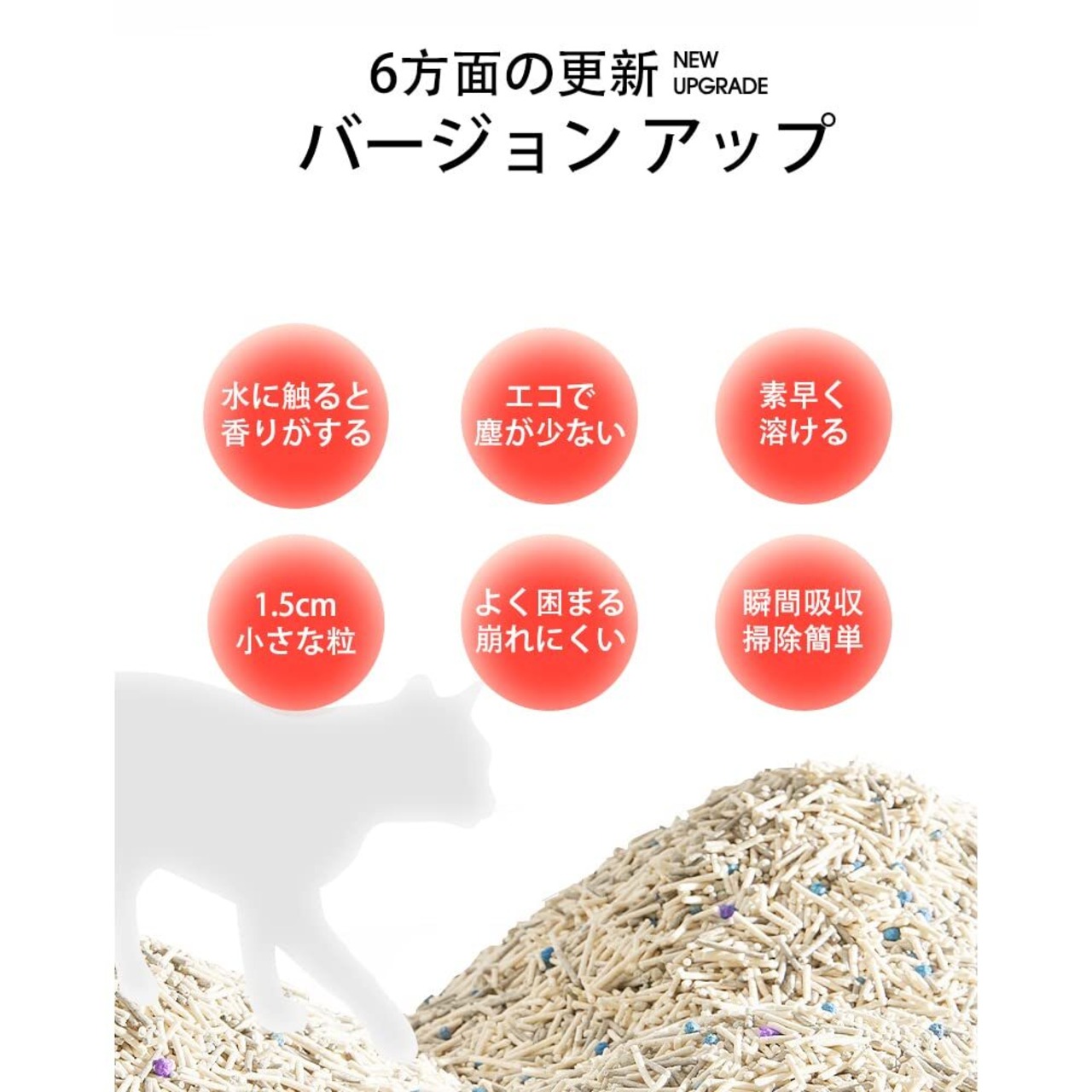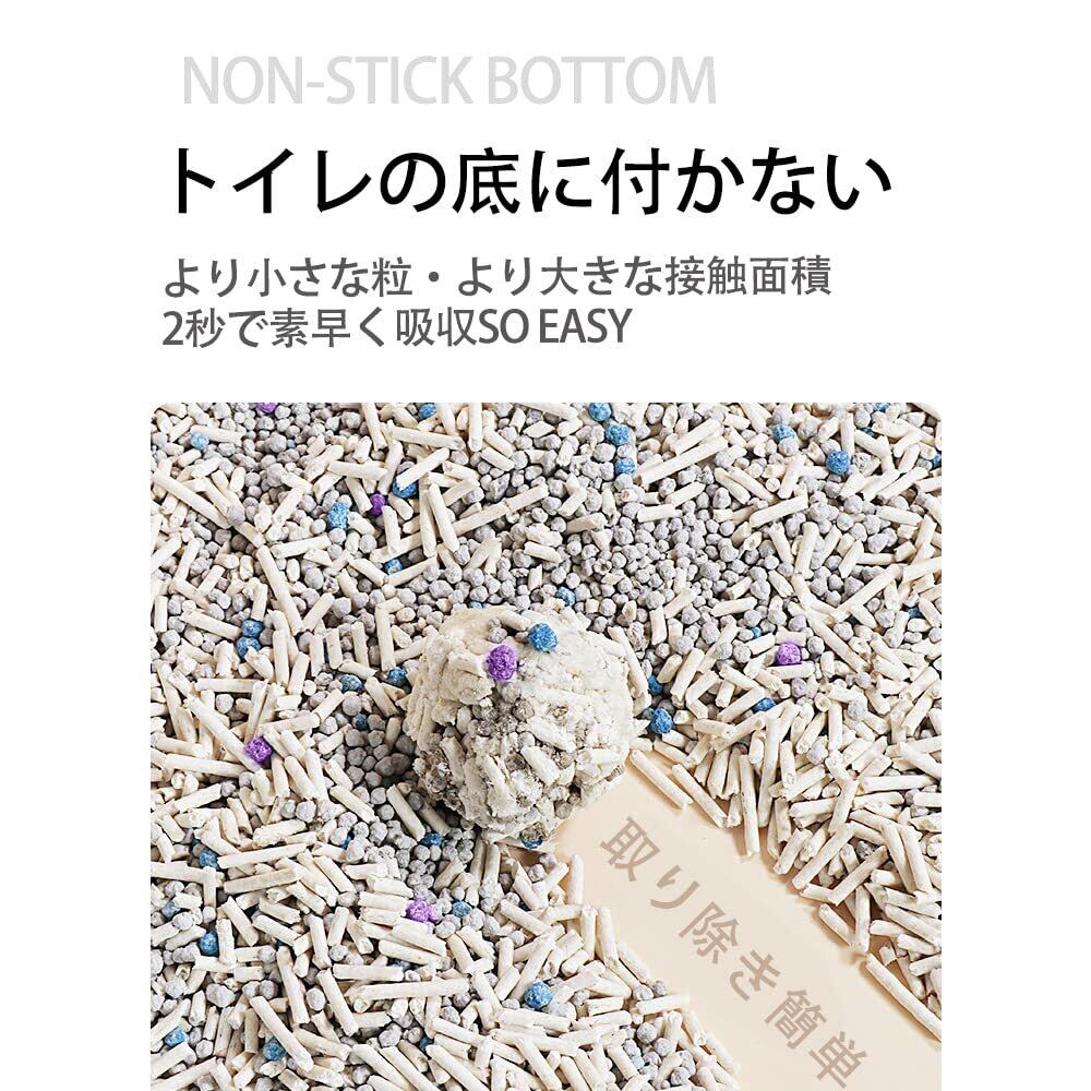 【複数の猫砂をMIX】 消臭力の高いおからに加えて、ベントナイトも加わることでさらにパワーアップ!大きさの異なる猫砂を配合することで隙間がなくなり、水分の吸収率が向上します。