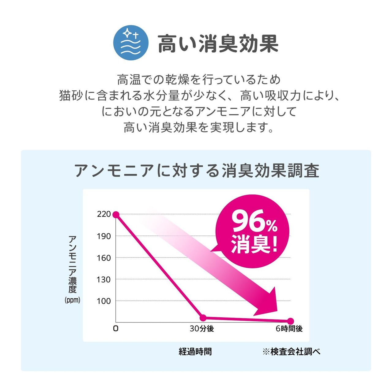 【高い消臭効果】高温で乾燥を行っているため猫砂に含まれる水分含有量が少なく、高い吸収性により、においの元となるアンモニアに対して高い消臭効果を実現しています。