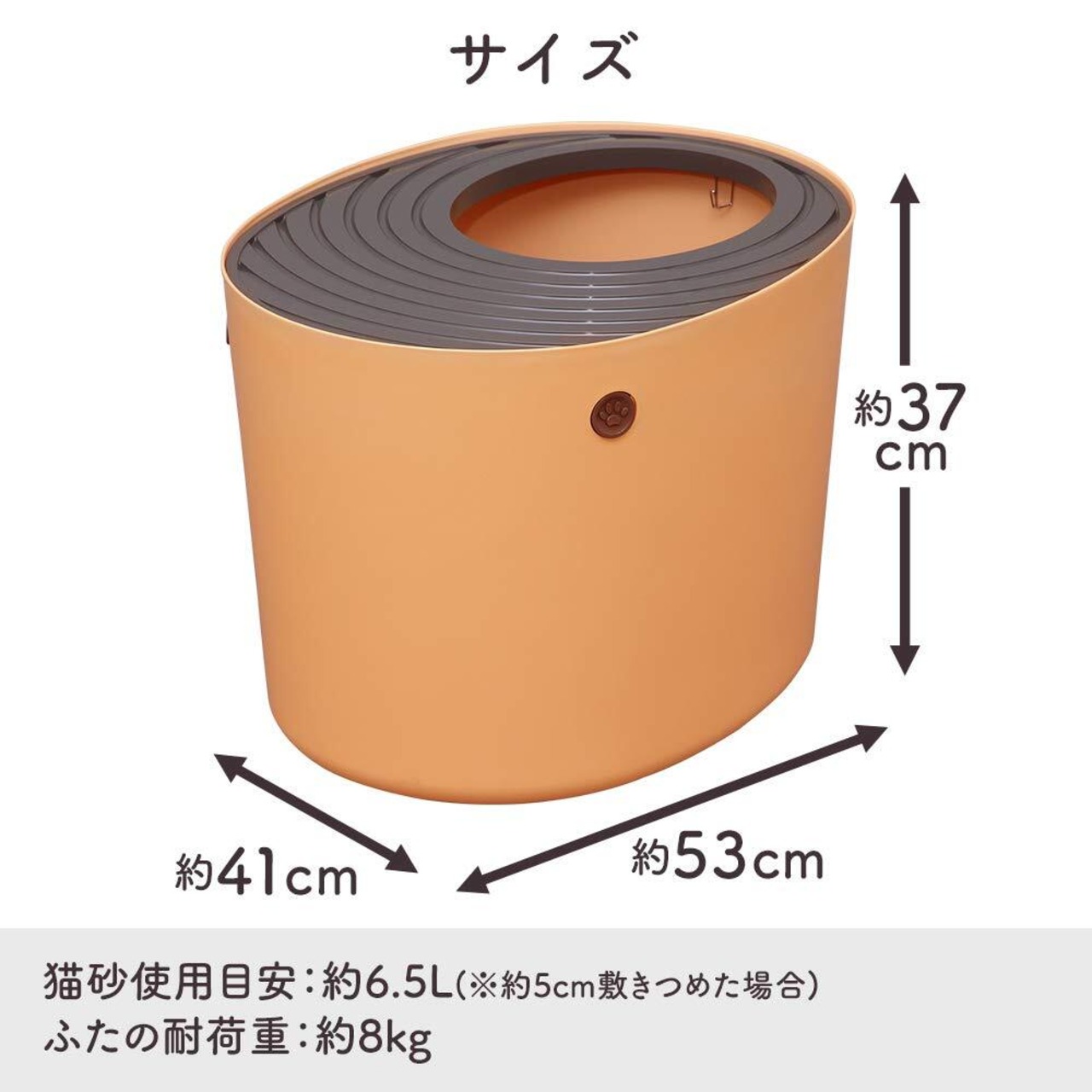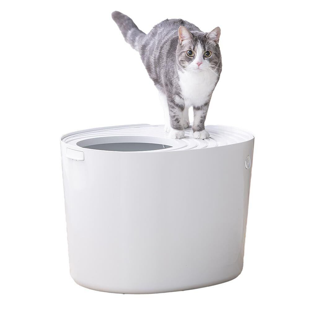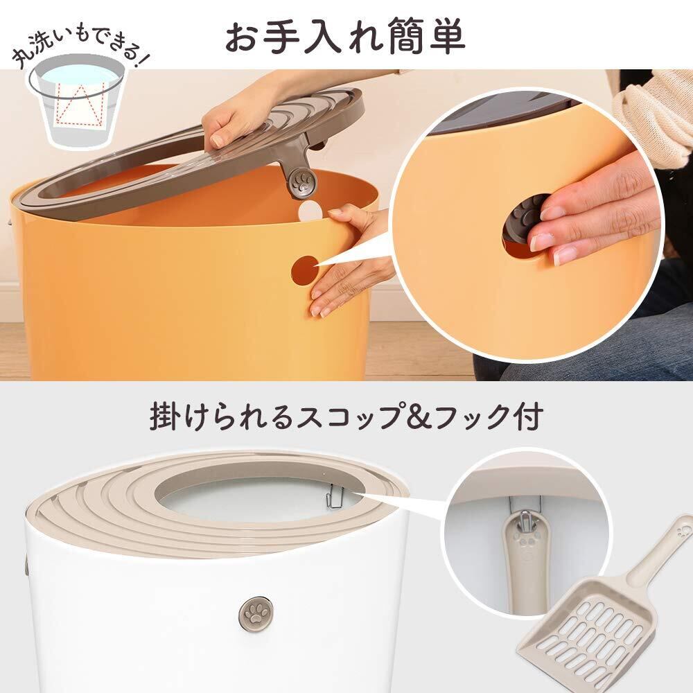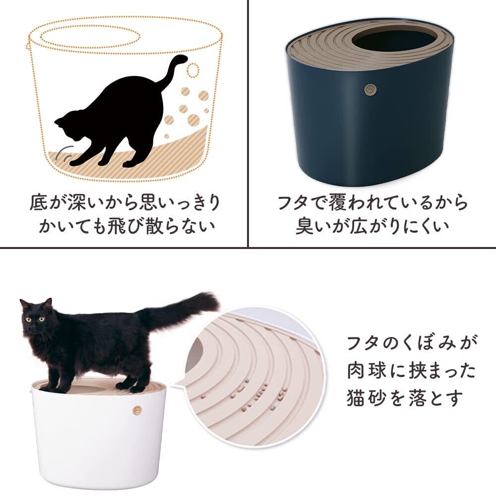 縦型デザインと飛び散り防止凹凸ふたで猫砂の飛び散りを解決する上から猫トイレです。猫の足に付着した砂が落ちやすように、ふたの溝で猫砂をキャッチして飛び散りを防ぎます。上ふた付きで臭いがもれにくいトイレです。お掃除しやすいスコップと、収納に便利なスコップフックが付いています。 使用方法 縦型デザインと飛び散り防止凹凸ふたで猫砂の飛び散りを解決する上から猫トイレです。猫の足に付着した砂が落ちやすように、ふたの溝で猫砂をキャッチして飛び散りを防ぎます。上ふた付きで臭いがもれにくいトイレです。お掃除しやすいスコップと、収納に便利なスコップフックが付いています。