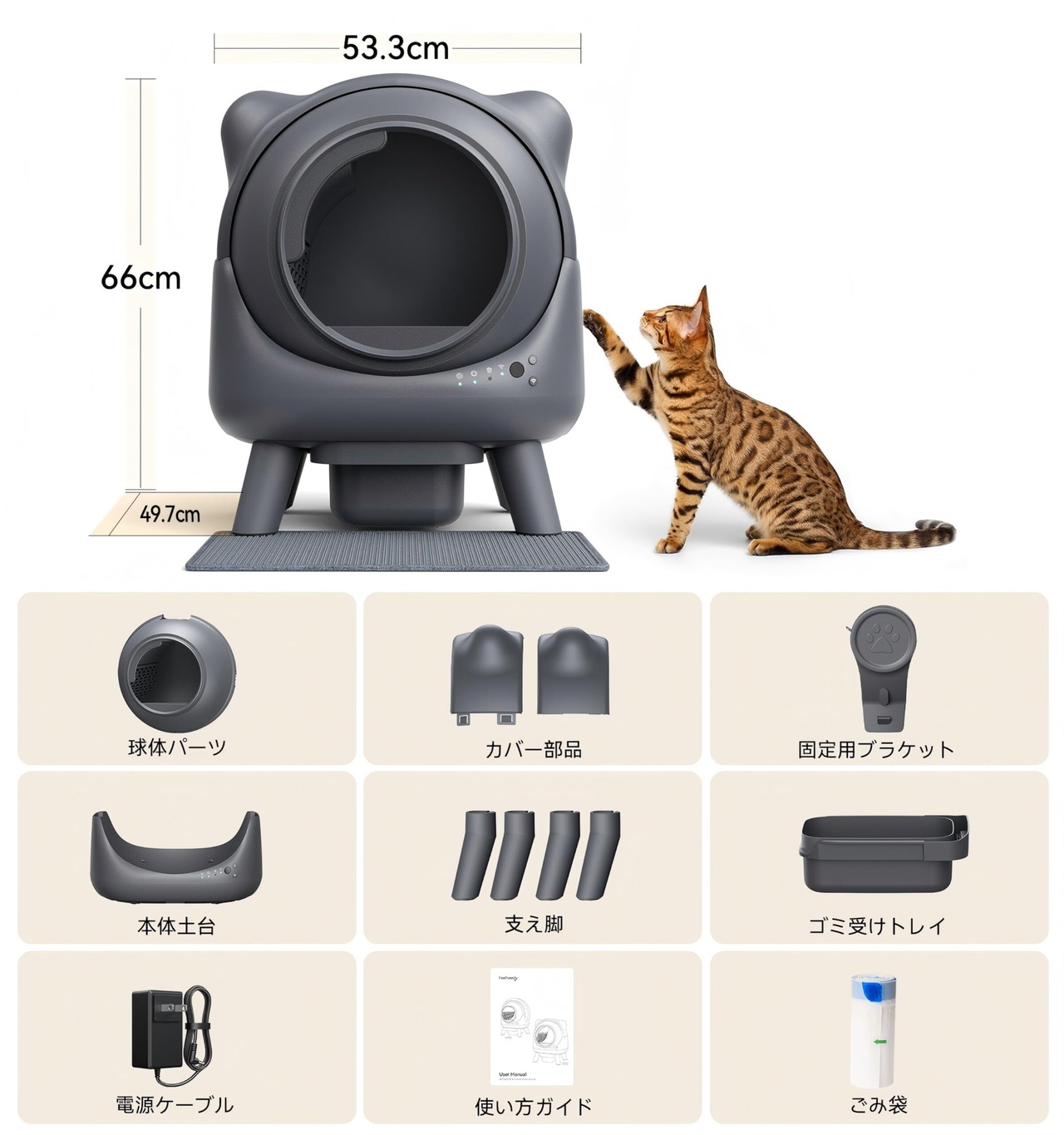 【製品仕様】長さ53.3cm*幅49.7cm*高さ66cm。2.4GHz帯WIFIに対応可能で、5GHz帯WIFIに対応不可で予めご了承をください。ご注意:FEELNEEDY猫自動トイレをご購入日から2年間の品質サービスを提供し、期間内に万が一故障したら新品を無償交換させて頂いております。また、もしご質問がございましたら、予めご連絡をお願いいたします。