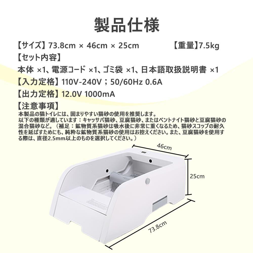 【製品仕様】ブランド:UEEYACの正規品です。※ブランド申請のタイミングが遅れたため、 プラットフォームの規約上、情報の変更ができない状況となっております。ペット用トイレサイズ:73.8cmx46cmx25cm;重量:7.5kg;セット内容:本体*1、電源アダプター*1、ゴミ袋*1、日本語の取扱説明書*1。フード付きタイプにはフードを付けてる。【アダプター】アダプターの仕様は日本仕様です。(入力定格:110 v-240v—50/60Hz 0.6A;出力定格:12.0V1000mA)【ご注意】本製品の猫トイレには、固まりやすい猫砂の使用を推奨します。以下の種類が適しています:キャッサバ猫砂、豆腐猫砂、またはベントナイト猫砂と豆腐猫砂の混合猫砂など。(補足:鉱物質系猫砂は吸水後に非常に重くなるため、猫砂スコップの耐久性を延ばすためにも、純粋な鉱物質系猫砂の使用はお控えください。また、豆腐猫砂を使用する際は、直径2.5mm以上のものを選択してください。)