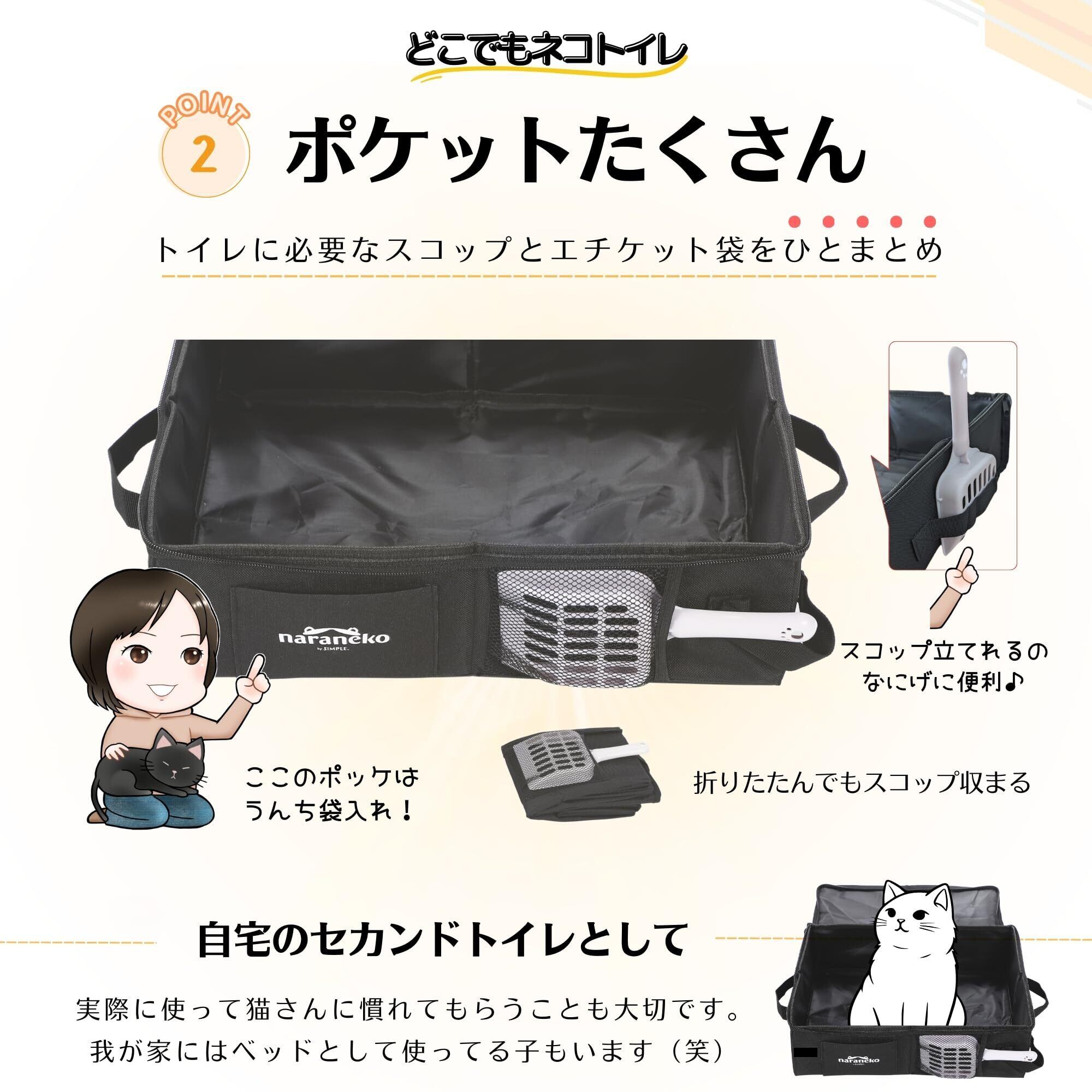 【ここが推し!ポケ付き・ふた付き・トッテ付き】あると便利なウンチ袋用ミニポケットとスコップを収納できるメッシュポケットを付けました。そしてファスナーで閉じられる蓋と両サイドのトッテがあることで、猫砂をいれたまま容易に移動させられます。