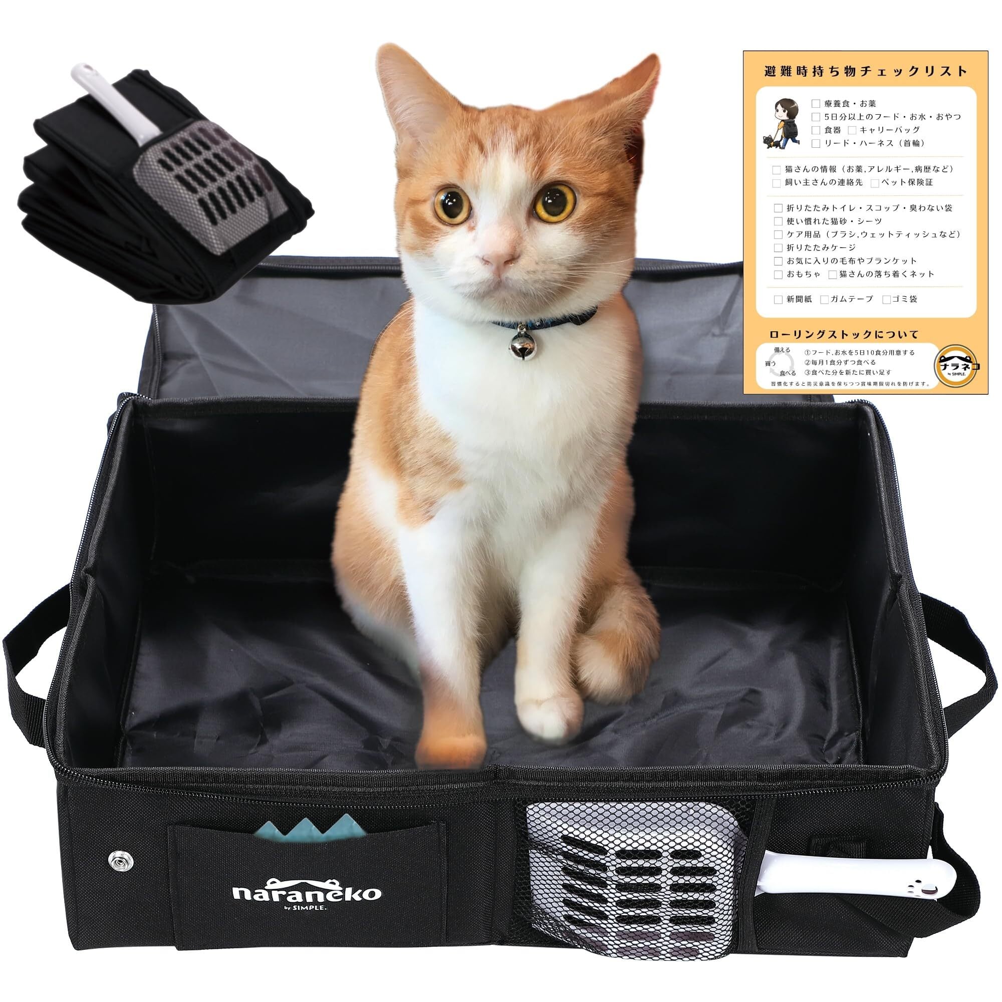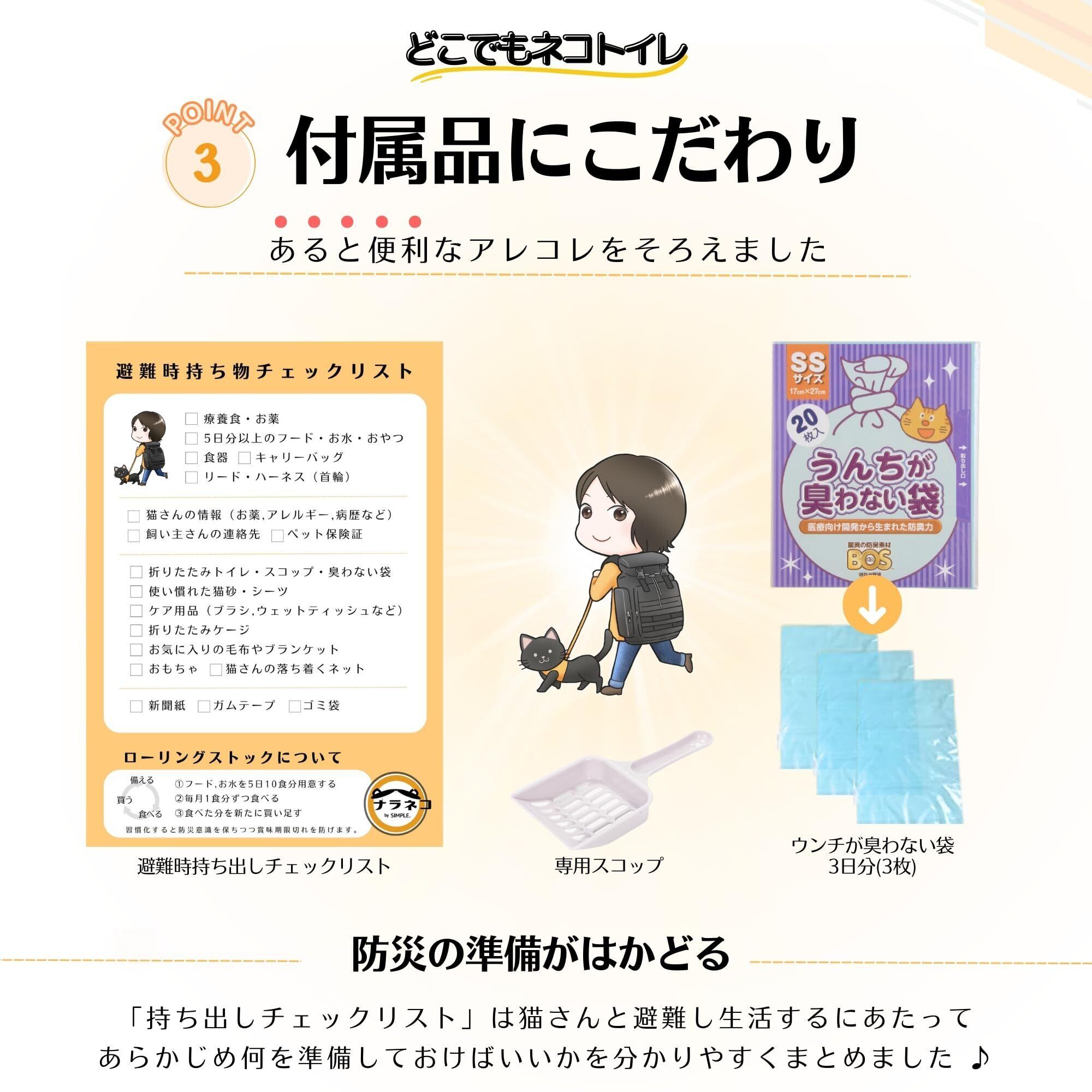 【ウンチ袋やスコップ、持ち出しチェックリストも付いてくる】別々に買うのがめんどうなウンチ袋(3日分)や専用スコップが付いてきます。また、猫との避難を想定して「避難時持ち出しチェックリスト」を作りましたので、もしものときの備えとしてお役立て下さい。