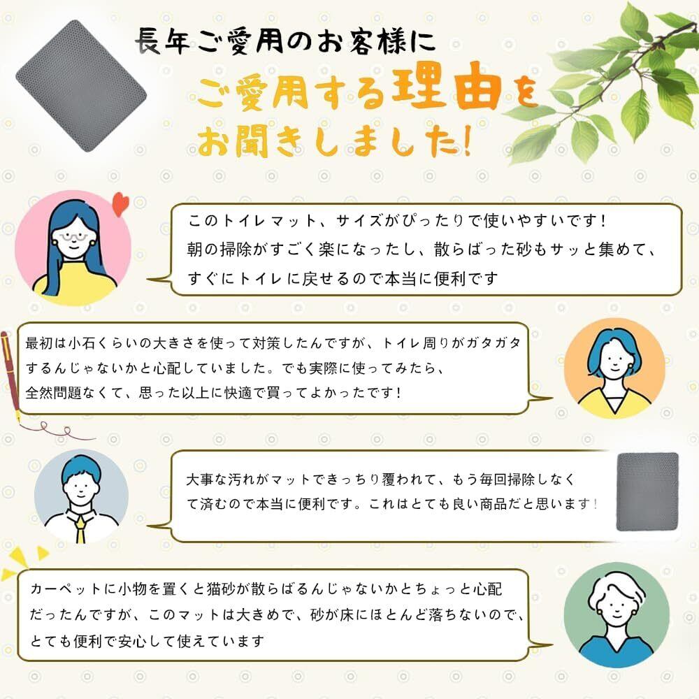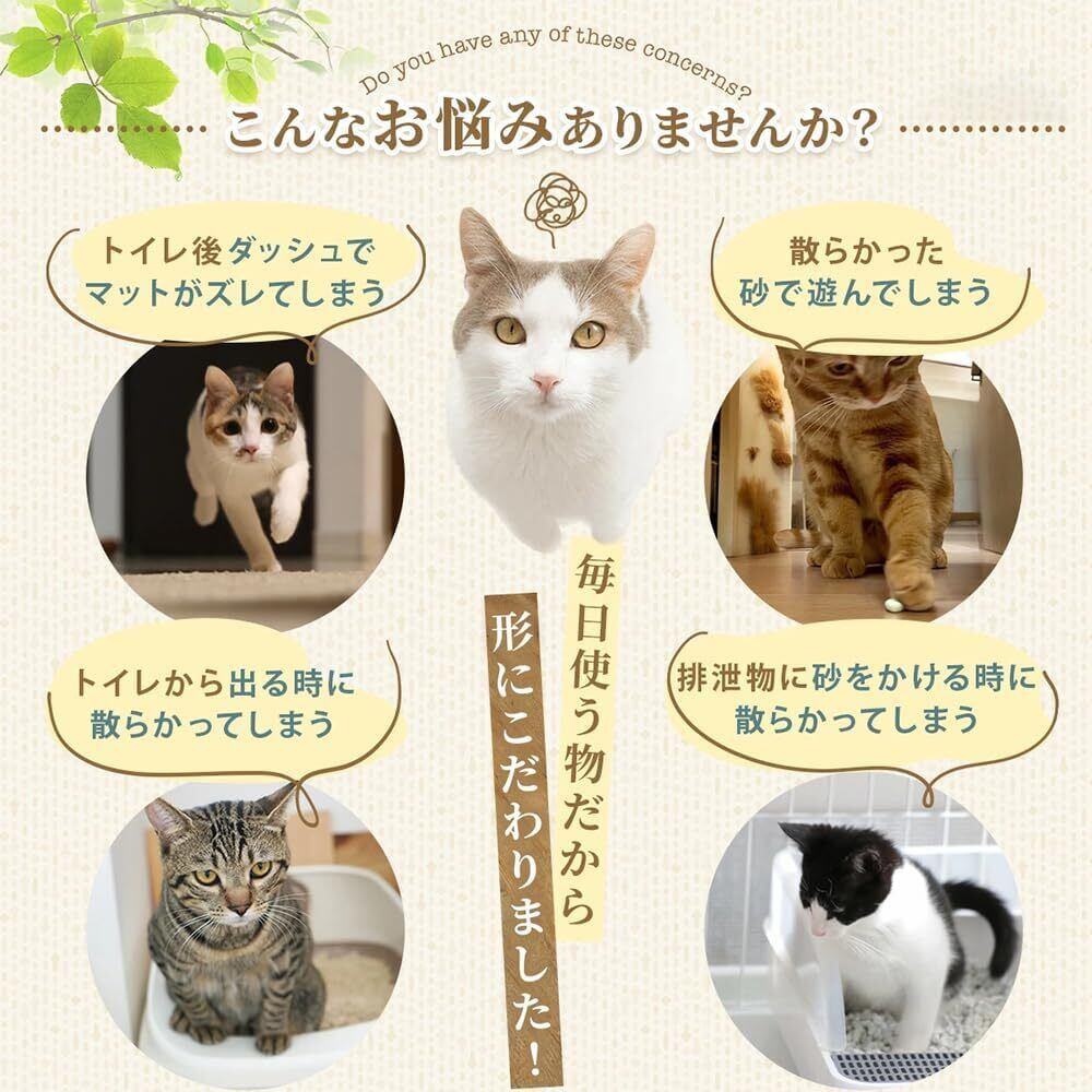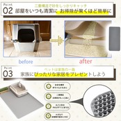 【簡単に掃除できる二層構造で猫砂の回収がスムーズ】 マットは二層構造になっており、上層のネットが猫砂をキャッチし、下層に落ちた砂や汚れをしっかりと収集します。この設計により、猫砂がトイレの周りに散らばるのを防ぎ、掃除が簡単になります。掃除が面倒な時でも、マットを持ち上げるだけで簡単に猫砂を回収でき、手間を省いて清潔さを保つことができます。日常的に使用するものだからこそ、掃除の簡単さにこだわった設計です。