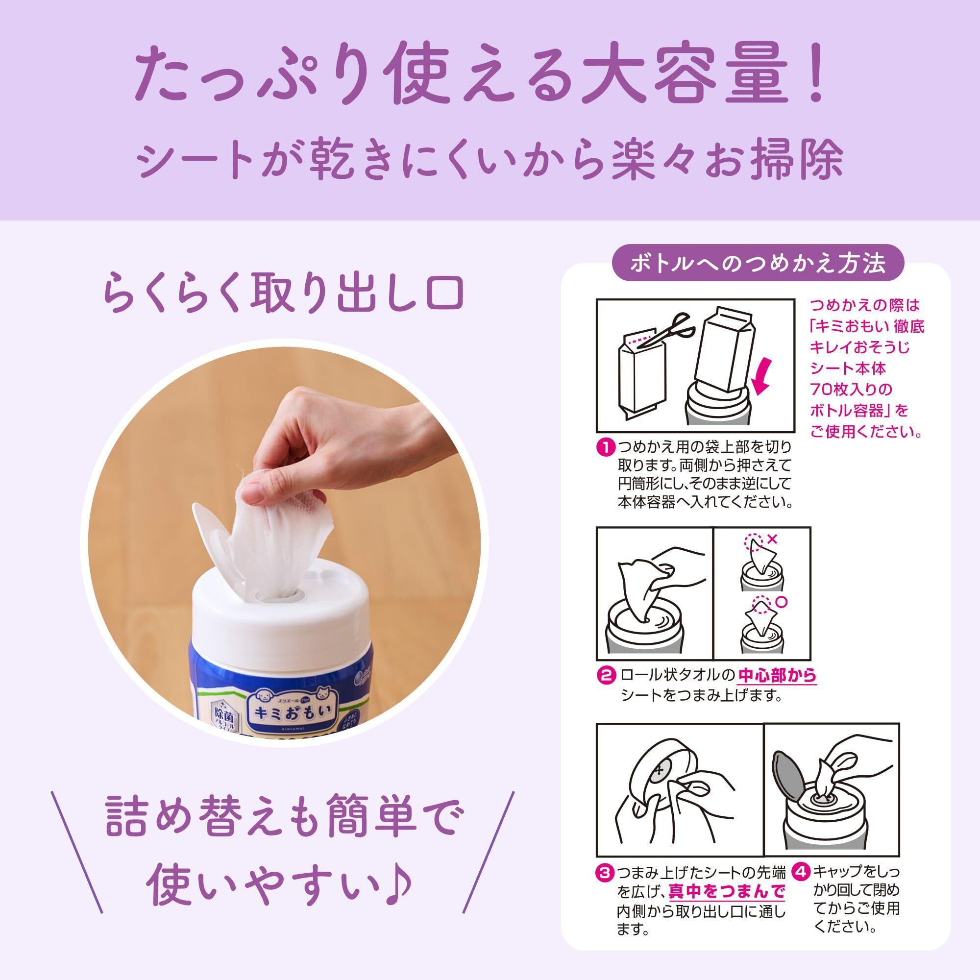 <ボトルへのつめかえ方法>1.つめかえ用の袋上部を切り取ります。両側から押さえて円筒形にし そのまま逆にして本体容器へ入れてください。2.ロール状タオルの中心部からシートをつまみ上げます。3.つまみ上げたシートの先端を広げ 真中をつまんで内側から取り出し口に通します。4.キャップをしっかり回して閉めてからご使用ください。つめかえの際は「キミおもい 徹底キレイおそうじシートボトル本体70枚入りのボトル容器」をご使用ください。