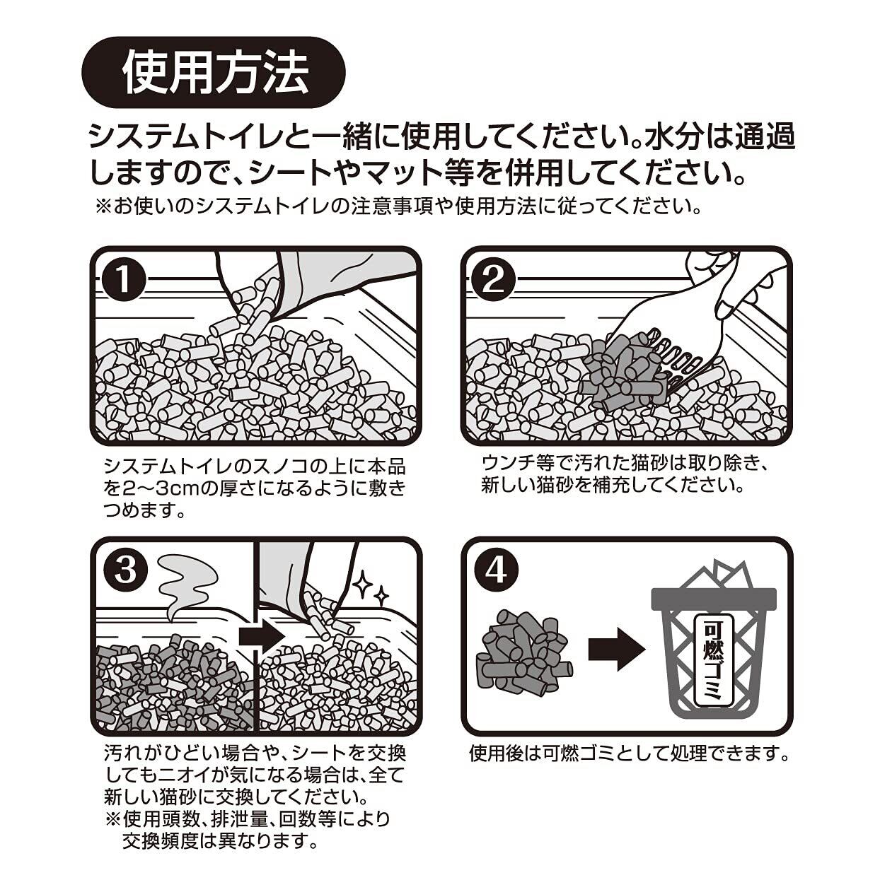 システムトイレと一緒に使用してください。水分は通過しますので、シートやマット等を併用して下さい。※お使いのシステムトイレの注意事項や使用方法に従ってください。①システムトイレのスノコの上に本品を2~3cmの厚さになるように敷きつめます。②ウンチ等で汚れた猫砂は取り除き、新しい猫砂を補充してください。③汚れがひどい場合や、シートを交換してもニオイが気になる場合は、全て新しい猫砂に交換してください。※使用頭数、排泄量、回数等により交換頻度は異なります。④使用後は可燃ゴミとして処理できます。