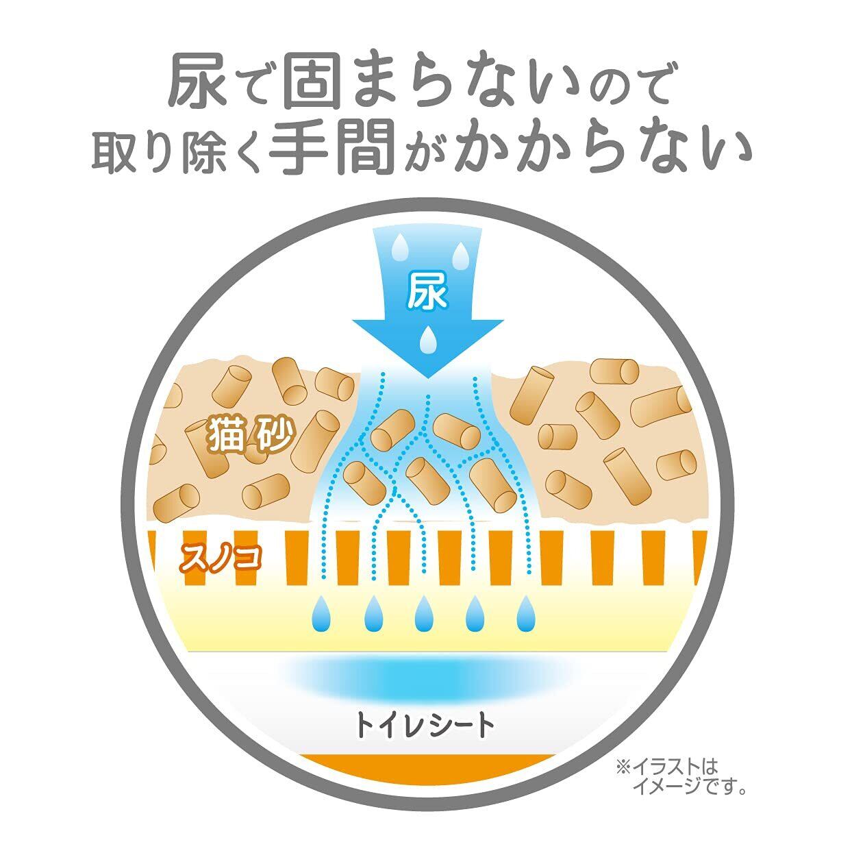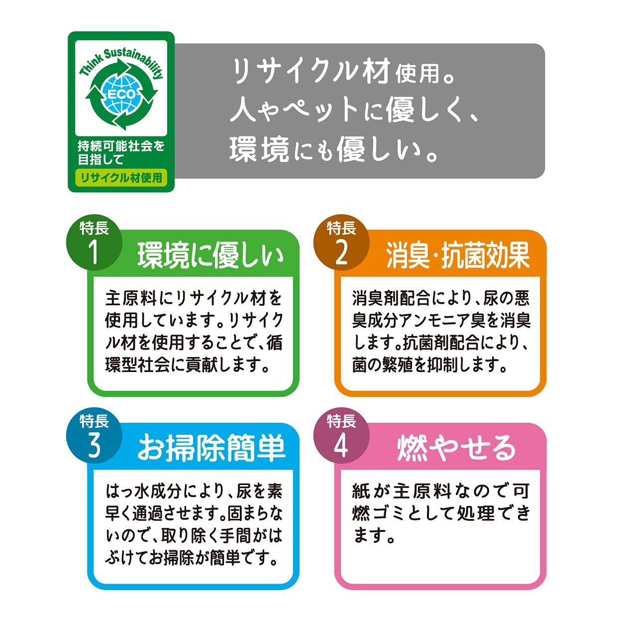 素早く消臭、尿で固まらないので取り除く手間がかからない。尿で固まらない猫砂なのでシーツと一緒にお使いください。猫砂専用の消臭剤『デオンD』が入っているため、消臭力が高いです。リサイクル材使用で環境にもやさしく、可燃ごみとして処理できます。