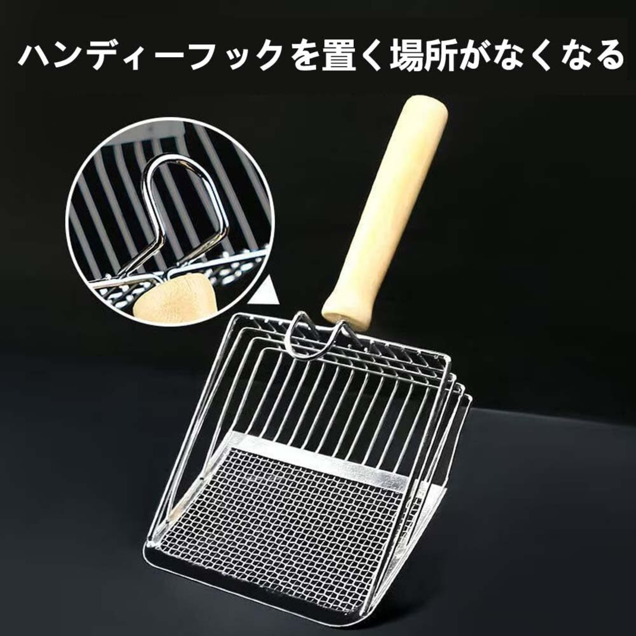 【便利な収納フック】シャベルにはフックが付いており、使用後は簡単に吊るして収納できます。場所を取らず、いつでもすぐに使える状態を保つことができます。こまごまとしたスペースを取らず、猫トイレ周りをスッキリさせることができます。
