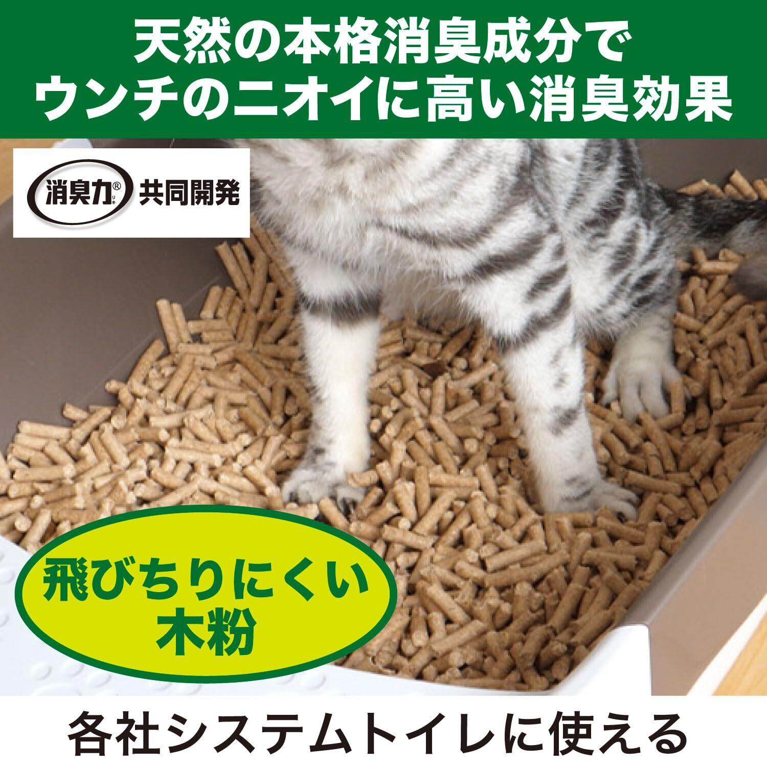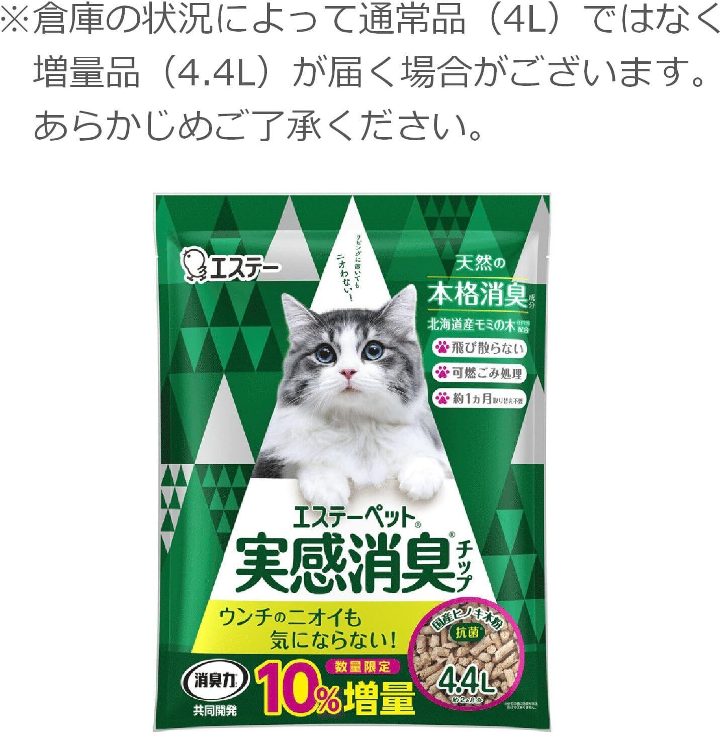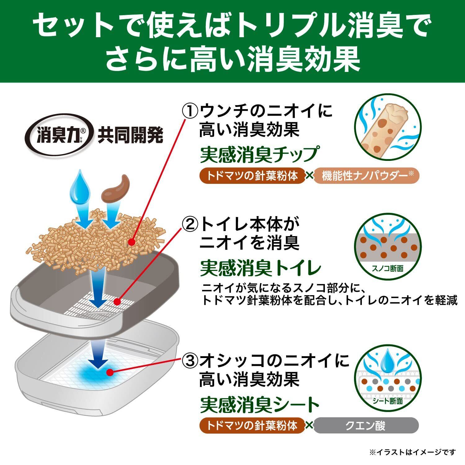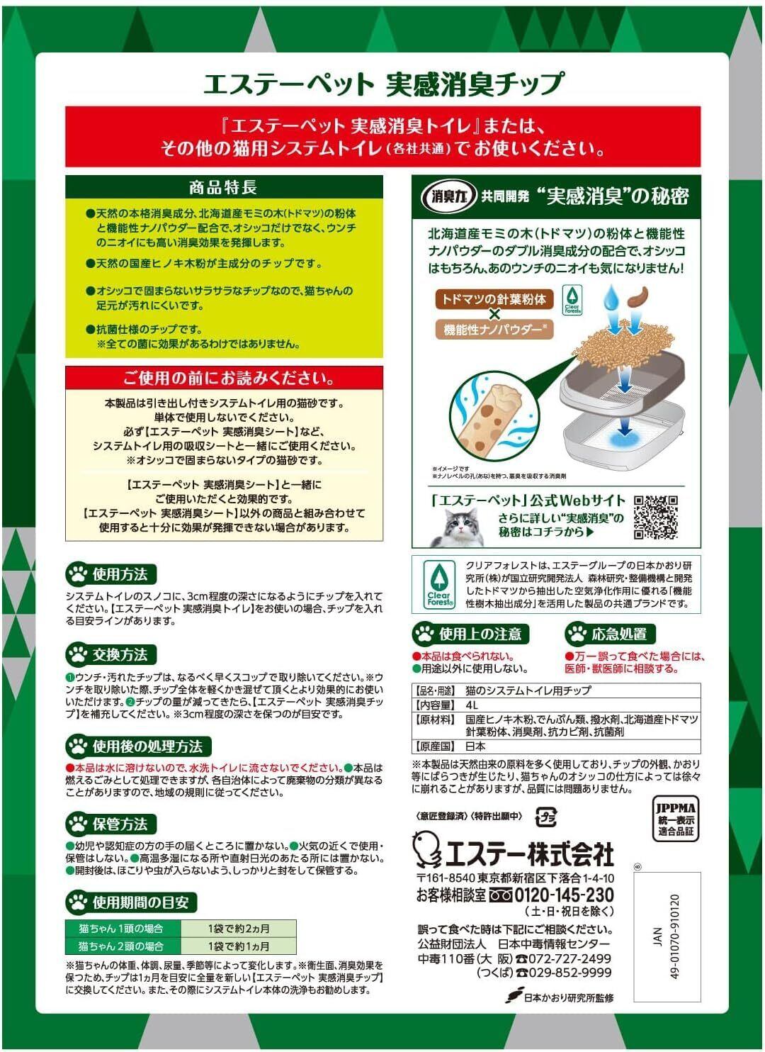 ●天然の本格消臭成分、北海道産モミの木(トドマツ)の粉体と機能性ナノパウダー配合で、オシッコだけでなく、ウンチのニオイにも高い消臭効果を発揮します。●オシッコで固まらないサラサラなチップなので、猫ちゃんの足元が汚れにくいです。●飛び散らず、粉が出にくいチップなので、お掃除も簡単です。●抗菌仕様のチップです。※すべての菌に効果があるわけではありません。 使用方法 ●本製品は引き出し付きシステムトイレ用の猫砂です。単体で使用しないでください。●必ず「エステーペット 実感消臭シート」など、システムトイレ用の吸収シートと一緒にご使用ください。※オシッコで固まらないタイプの猫砂です。●「エステーペット 実感消臭シート」と一緒にご使用いただくと効果的です。●「エステーペット 実感消臭シート」以外の商品と組み合わせて使用すると十分に効果が発揮できない場合があります。●システムトイレのスノコに、3cm程度の深さになるようにチップを入れてください。「 エステーペット 実感消臭トイレ」をお使いの場合、チップを入れる目安ラインがあります。●(1)ウンチ・汚れたチップは、なるべく早くスコップで取り除いてください。※ウンチを取り除いた際、チップ全体を軽くかき混ぜて頂くとより効果的にお使いいただけます。●(2)チップの量が減ってきたら、「エステーペット 実感消臭チップ」を補充してください。 ※3cm程度の深さを保つのが目安です。●本品は水に溶けないので、水洗トイレに流さないでください。●本品は燃えるごみとして処理できますが、各自治体によって廃棄物の分類が異なることがありますので、地域の規則に従ってください。