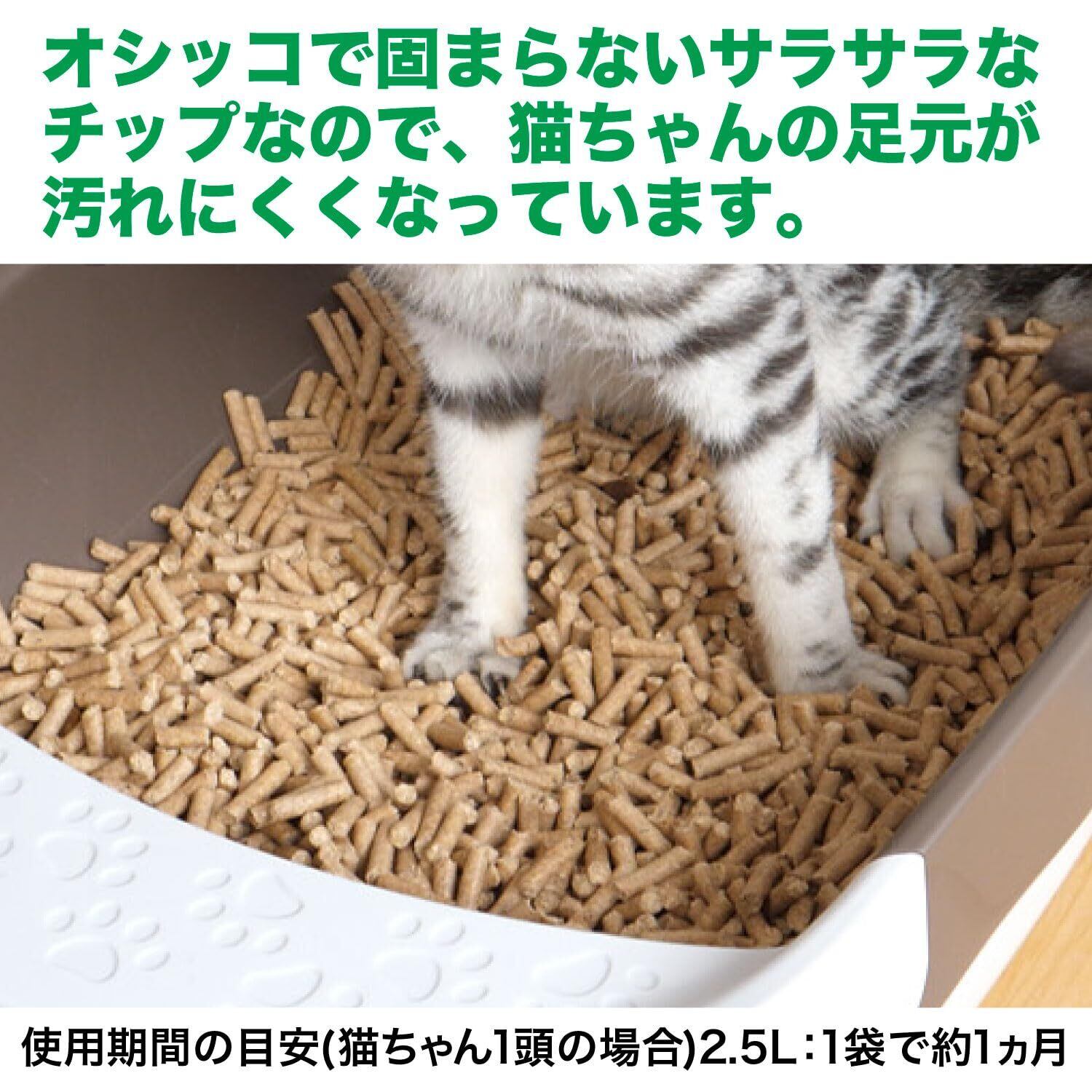 【サラサラなチップで足元が汚れにくい】オシッコで固まらないサラサラなチップなので、猫ちゃんの足元が汚れにくいです。※ウンチを見つけたら、なるべく早く取り除いてください。