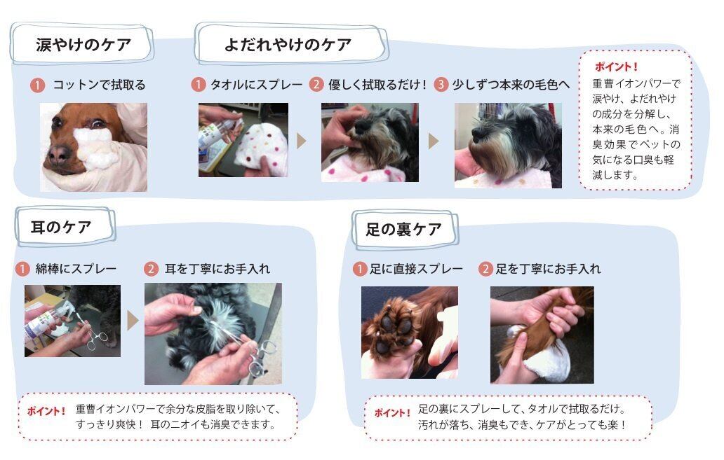 ●目や耳のお手入れには、コットン等に2~3回スプレーし、タオル等で拭取ります。●口の周りや中の洗浄や口臭対策にも有効です。直接スプレーできます。●おもちゃや食器類の汚れには直接スプレーし、拭き取るか、水ですすぎ流します。●本品は約400回スプレーできます。