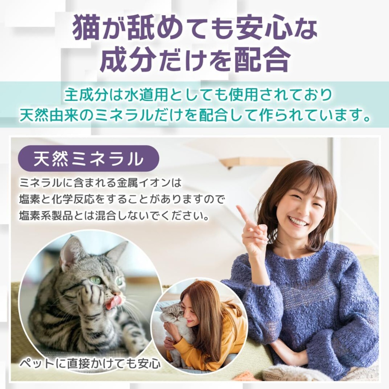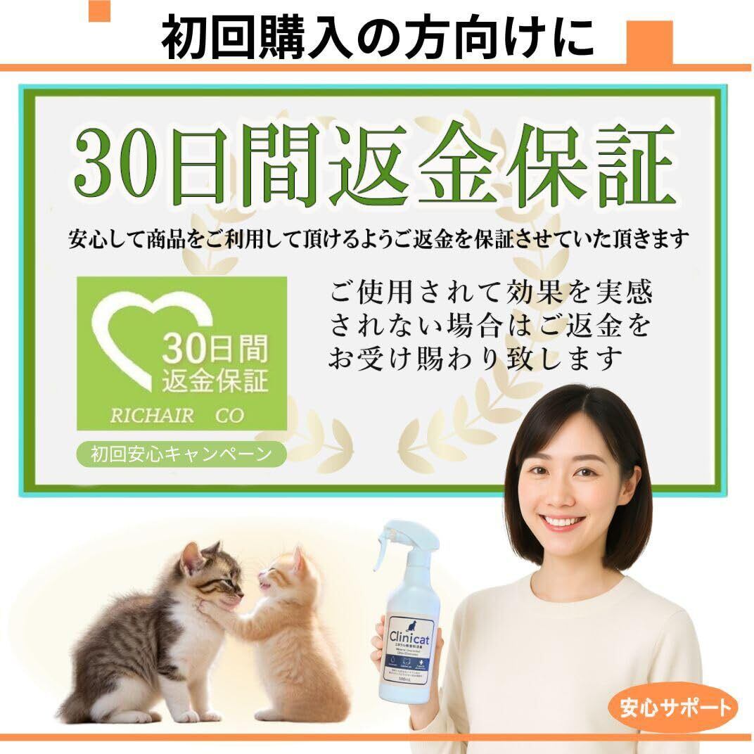 【安心安全】クリニキャットは、猫が舐めても安心安全な成分で作られた猫専用消臭スプレーです。塩素・アルコール・香料を一切使用せず、無香料なので、猫が嫌がらず日常的に使えます。敏感な猫や子どもがいるご家庭でも、安心しておしっこ防止や匂い消しに活用できます。