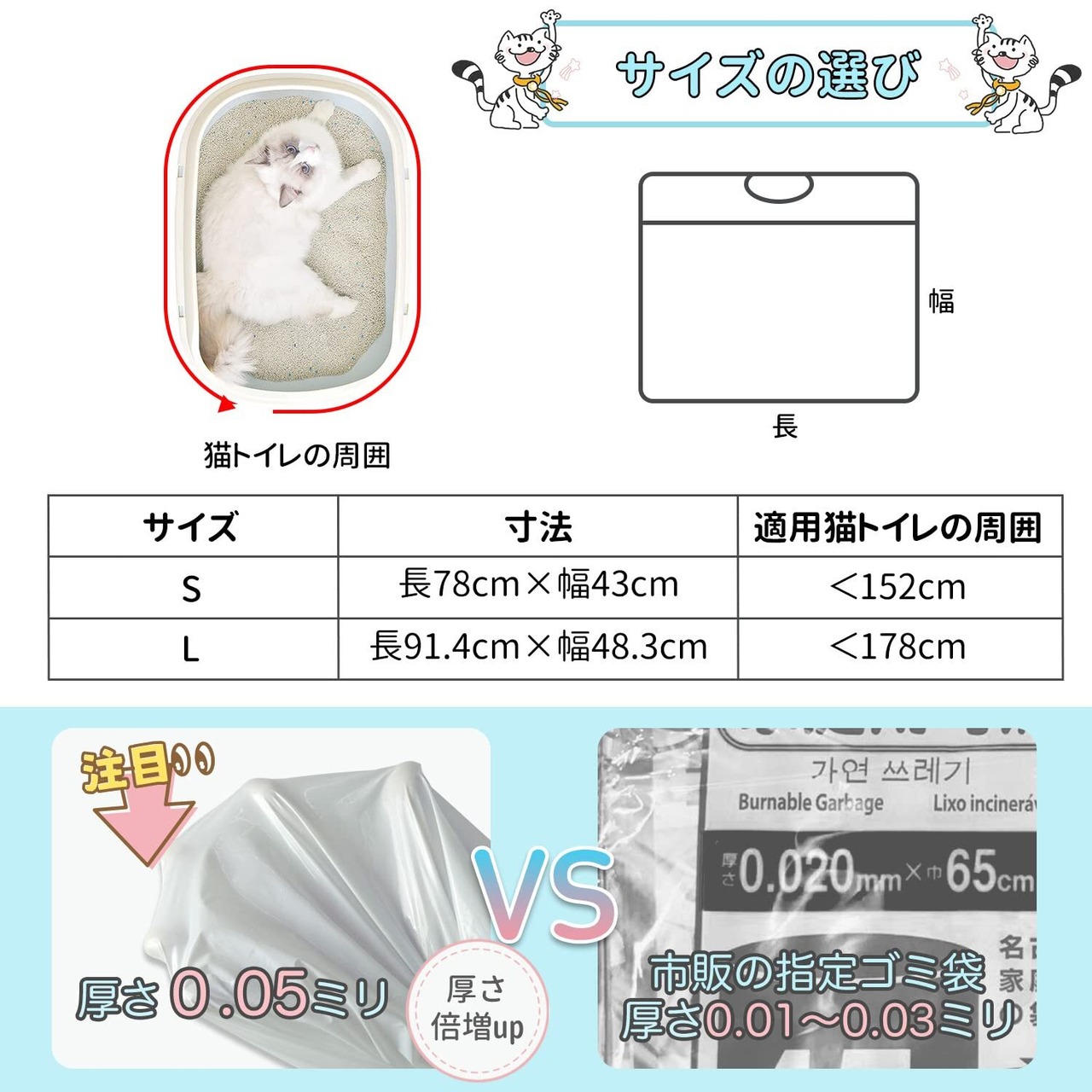 【対応の猫トイレタイプが多い】よく使う2サイズ展開、様々な猫トレに適用。ご使用の猫トイレのサイズを確認したうえ、ご購入してください。TIPS:蓋なしタイプの猫トレイに使用する際に、クリップで猫砂袋を固定すれば、袋のズレがにくくなり、より快適な使用間を得られます。<お問い合わせ>使用中何かご質問がございましたら、お気軽いに注文履歴からまで連絡してください。