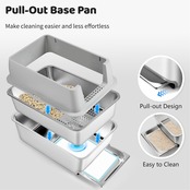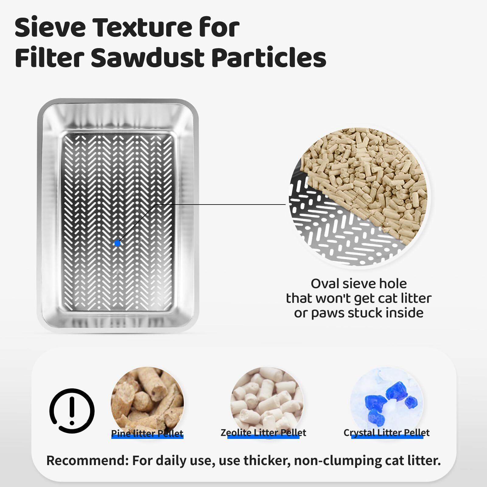容易なろ過のための鍋をふるい分けること: 私達の猫のごみ箱は楕円形の穴が付いているふるい分け鍋によって来、非塊状になる猫砂を詰まらないし、尿をすぐにろ過するのを助けます。大きい粒状の猫砂は松の砂の餌のような、推薦される