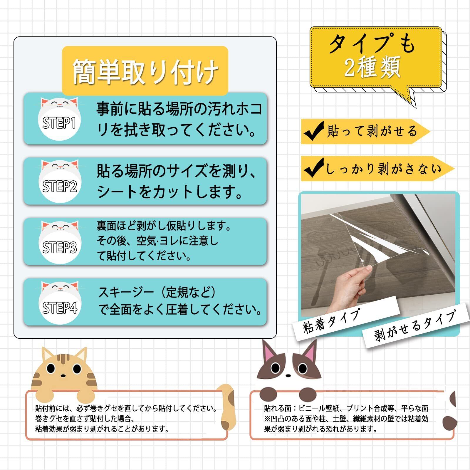 【PVC安全エコ素材】経験豊富なペット用品デザイナーとシート専門工場が共同開発した壁紙保護シートは、最高の接着力を持っています。 強化PVC製、無毒で環境に優しい素材で、ペットに舐められても安心! この猫用の壁紙保護シートは爪研ぎ、引っ掻いや汚れに対して非常に役立ちます。 素材によっては時間がたつと少し糊がつくことがありますが、消しゴムを使用して簡単に取れます。